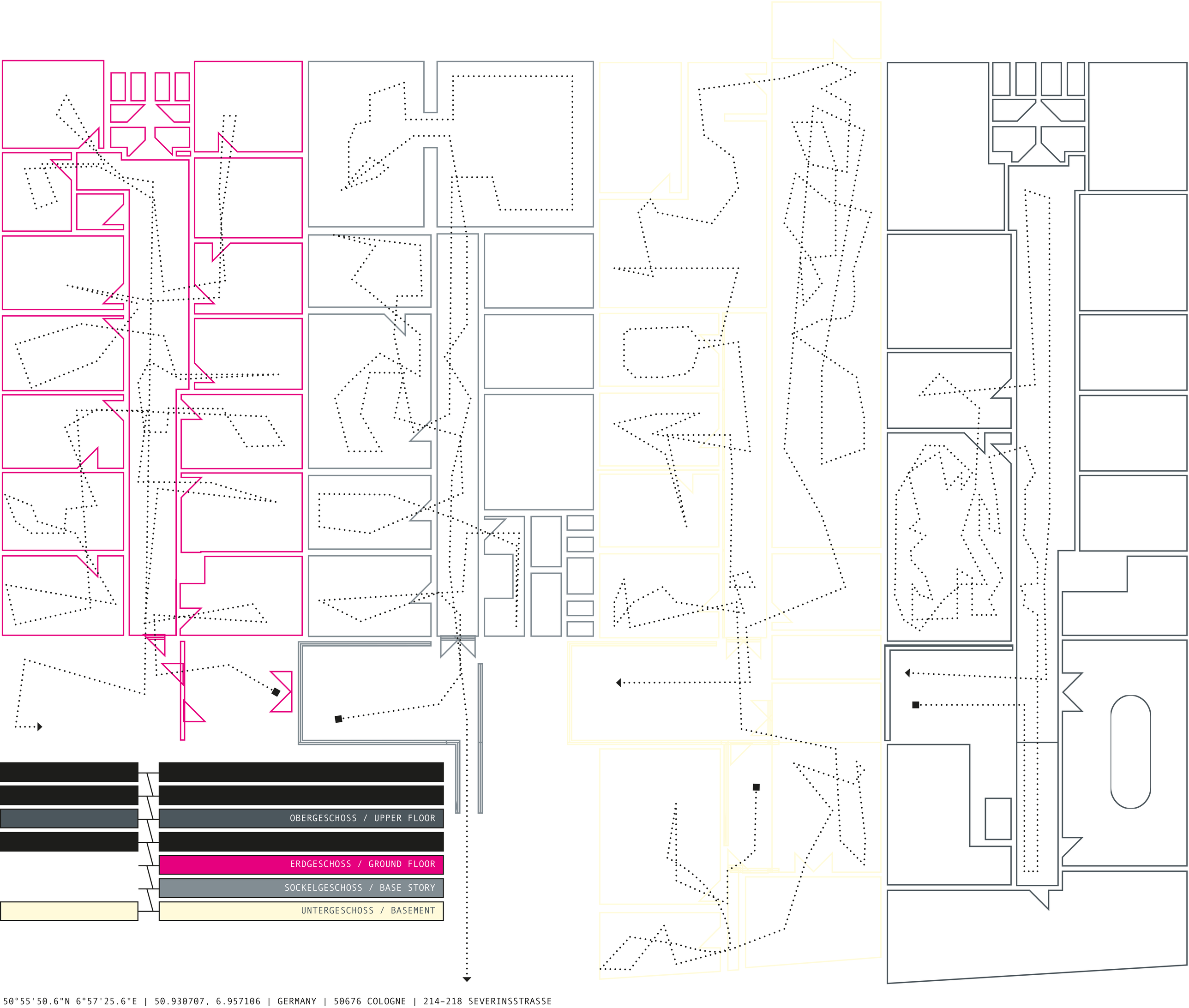 A glance at the floor plans of the four floors of the former office building at 214-218 Severinstrasse immediately reveals the hopelessness of an overview, the impossibility of an objective point of view, a perspective on the ensemble as a whole. After five previous building sound compositions, a complexity had been reached for which one cannot prepare oneself. The four methods of building sound composition:
