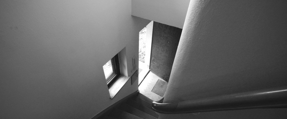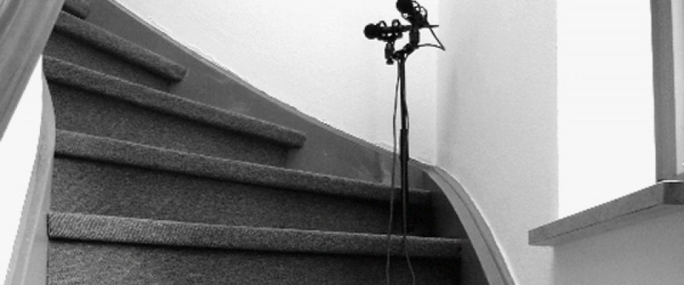 Going up and down the stairs, I always pass a corner of the carpeted steps. When going up the stairs, and when descending, one approaches a wall before turning down a hall. At the end of the second week, while sitting on a bus into town, it occurs to me that when I turn at that particular spot and stand in the corner, I hear more downward with my left ear, and on my right ear, I hear more from upstairs. Very basic. The next morning, I sit on the spot in the corner of the stairs. I have found my listening spot.