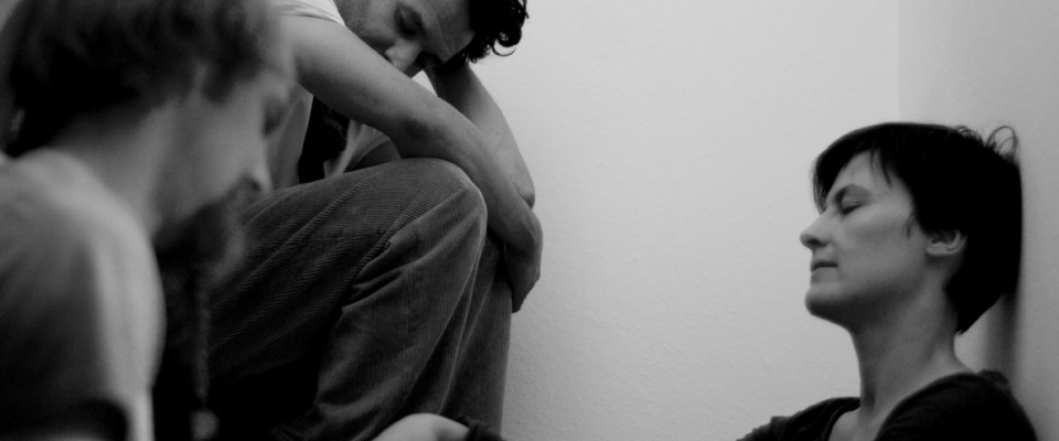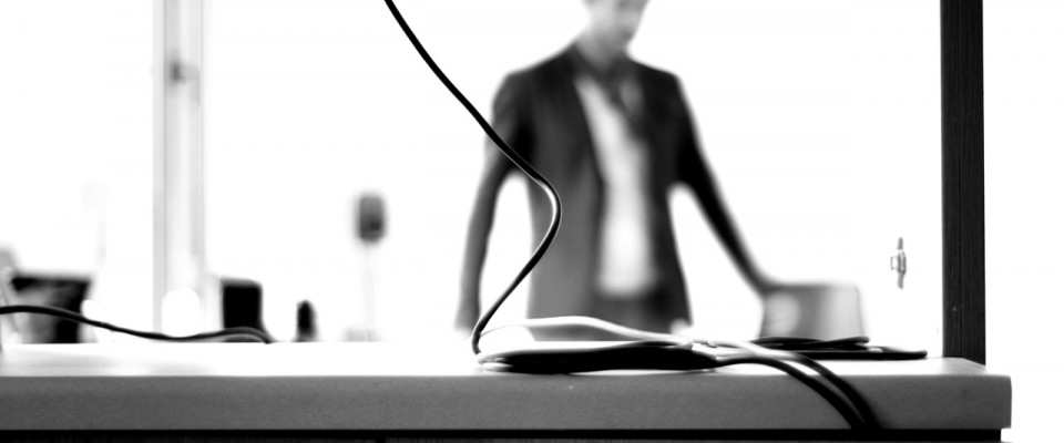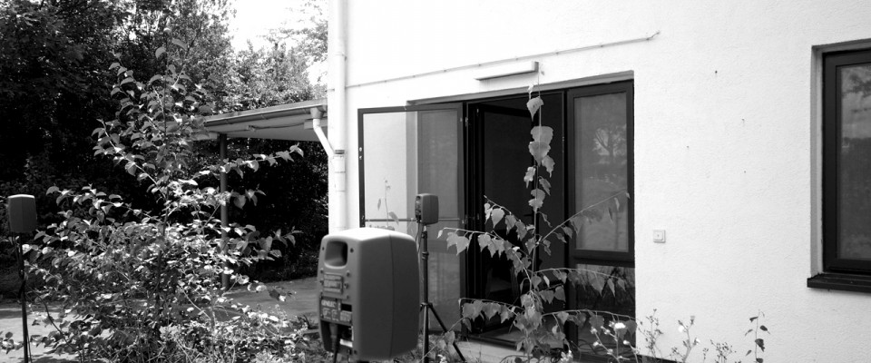 I try to find an electro-acoustic equivalent to the sound made by crickets; using a random generator I play little bursts of electronic chirping with varying densities. I also use differently tuned sinus generators directed towards the rooms so that I can hear moods colored by the different rooms at my listening point and then I attempt to modulate and compose them. To my back, noise penetrates the building through the noise barrier outside, through the bushes, and the building’s outer wall.