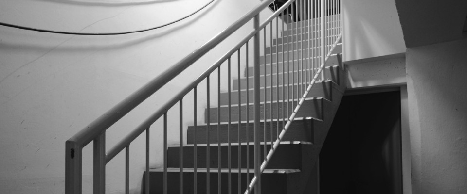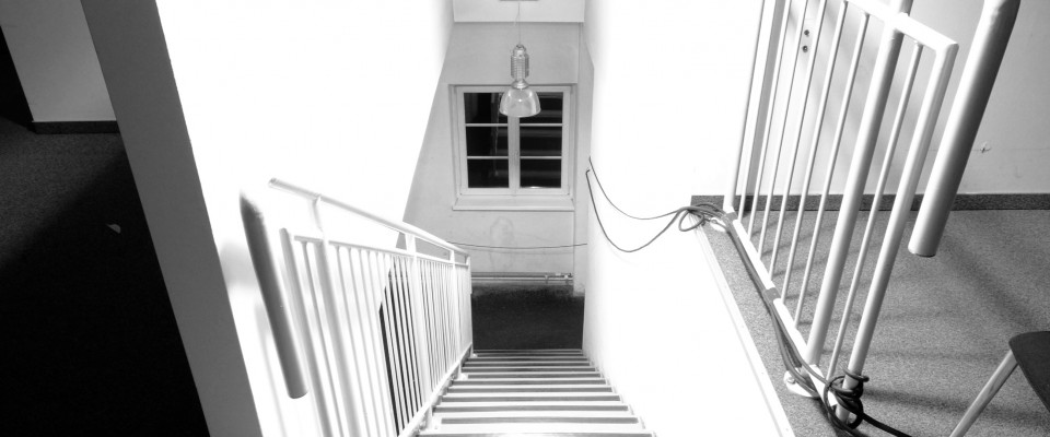 After my experience in Wurzburg, I concentrate very early on the stairs in the Graz building. It is an open set of stairs made out of concrete and connecting the first and second floors, it is a natural acoustical “bridge“ spatial system of both floors. Standing at the top of the stairs, one can hear acoustical occurrences on both floors. After just one week it is clear to me that this point will be the listening point for my composition. This is where I set up the digital audio equipment and laptop for the subsequent spatial inquiry.