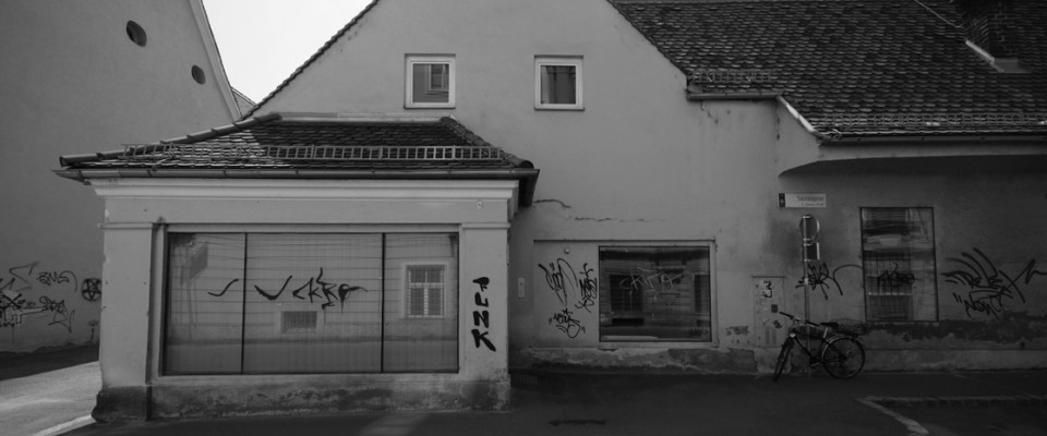 Finding an empty building in Graz proved to be quite a complicated task. After much research and several calls, I was able to contact someone from the state administration of Styria. The building suggested for the project was number 4 Sauraugasse. It is an L-shaped building, one side of which is located on the street Sauraugasse, and the other on a side street. During the first viewing of the building in April 2011 in the accompaniment of a man from the Styria local administration, there were offices inside. When I was given the key on August 1 that year and entered the building alone, the building was empty. The atmosphere was thus completely different from what it had been. Where once were tables and cabinets now were merely hard cement flooring, large glass surfaces facing the street and the courtyard, where there were large metal doors and remnants of earlier occupiers of the building like metal scraps, garbage bags, an old plotter, piles of rubble and a heap of metal signs with the word 'Ortsbildschutzgebiet' printed on them.