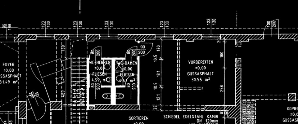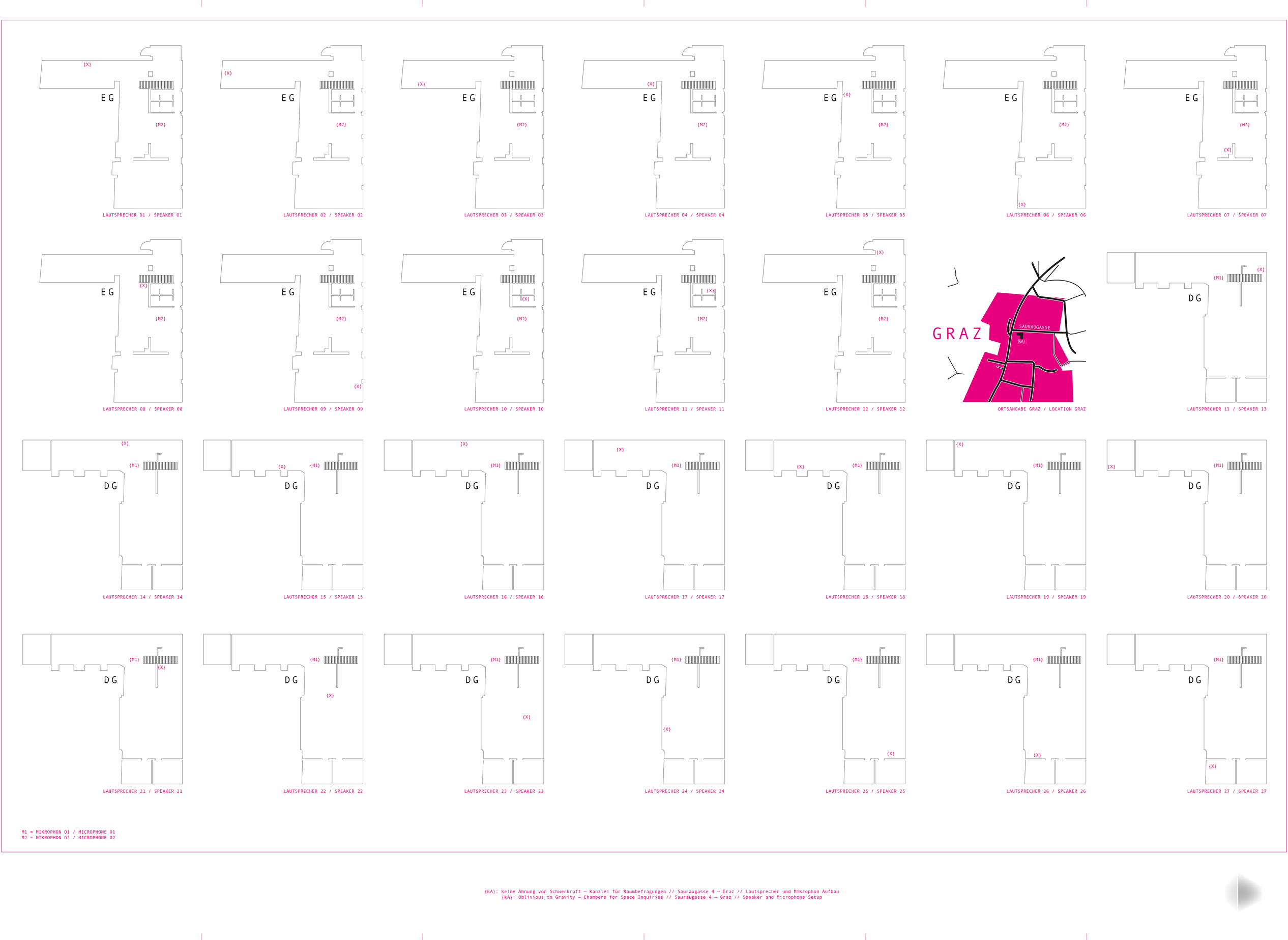 Aside from that, there is a lot of light and sounds from outside that penetrate through the windows and into the halls. It all has the atmosphere of a workshop — bare rooms, long reverberation times, diffuse. Looking at the blueprint sent to me by the Styria administration, two walls on the ground floor in the wing facing the side street seem to be missing. New rooms had been built and drywalls put up. During the first week, I sit on a chair in different corners on the ground floor. During office hours, the sound of cars driving over a loose manhole cover and of a few pedestrians on the street walking by can be heard. Every now and again, a church bell rings and sometimes the sound of people talking in the courtyard can be heard. The ground floor is divided up into small rooms that lead to further segments. There is not a hallway from which all rooms go off. If you open all of the doors in the inner section, you can hear almost all of the sounds outside at different volumes. If you only crack the doors, the sounds are audibly muffled and filtered. On the weekends, there are fewer cars and more pedestrians. Masses of people walking to the city park pass the house. On Saturday night, there is a caravan of party people moving slowly from the castle Schlossberg to the Forum Stadtpark; they rumble on into the wee hours of the morning. I sit inside in the dark. I am right in the middle of a busy, bustling city and see the shadows of people passing; I can see their silhouettes, hear the reverberation of their voices, and footsteps that sound through the building, and have the feeling I am dissolving into this fog of sound. {…}