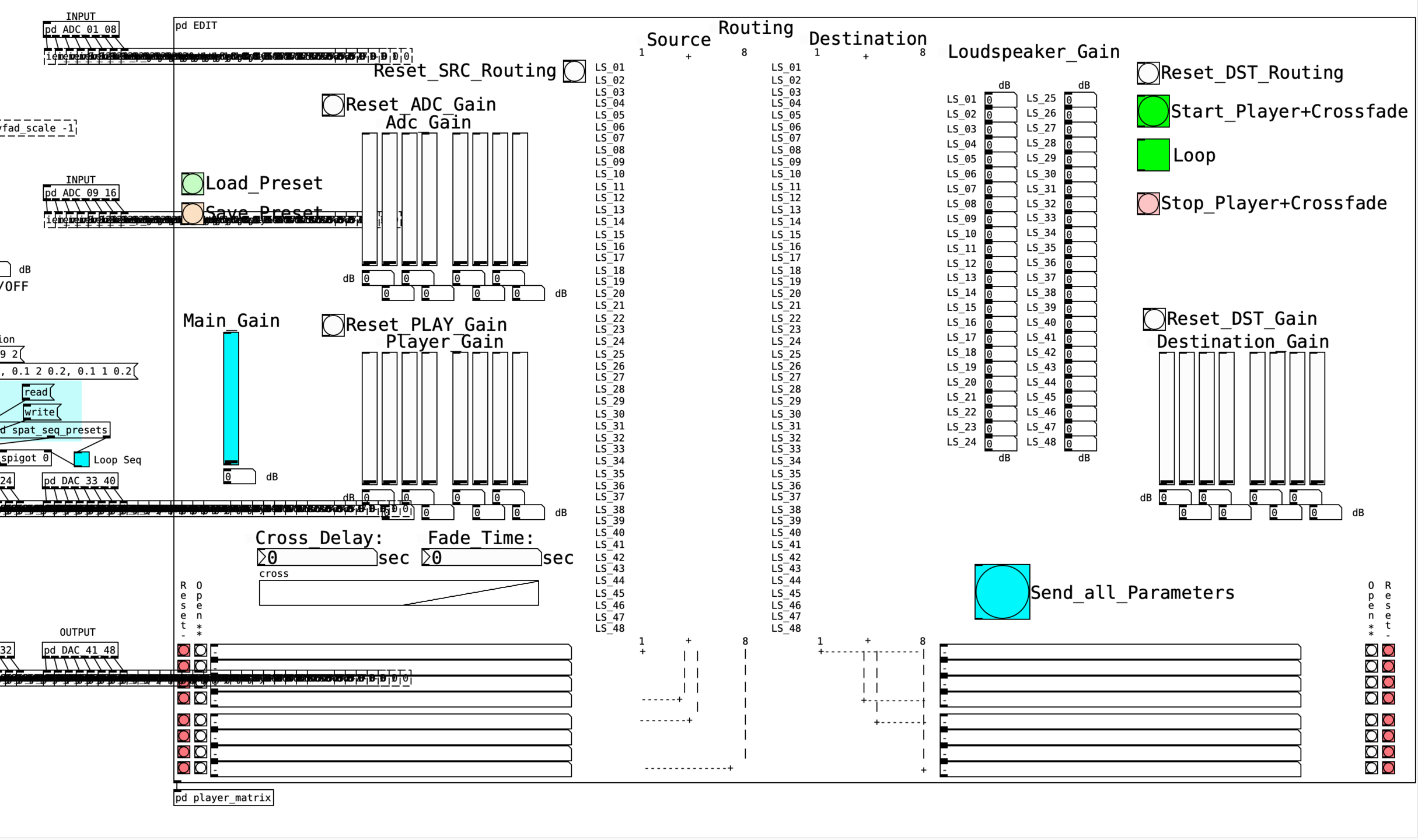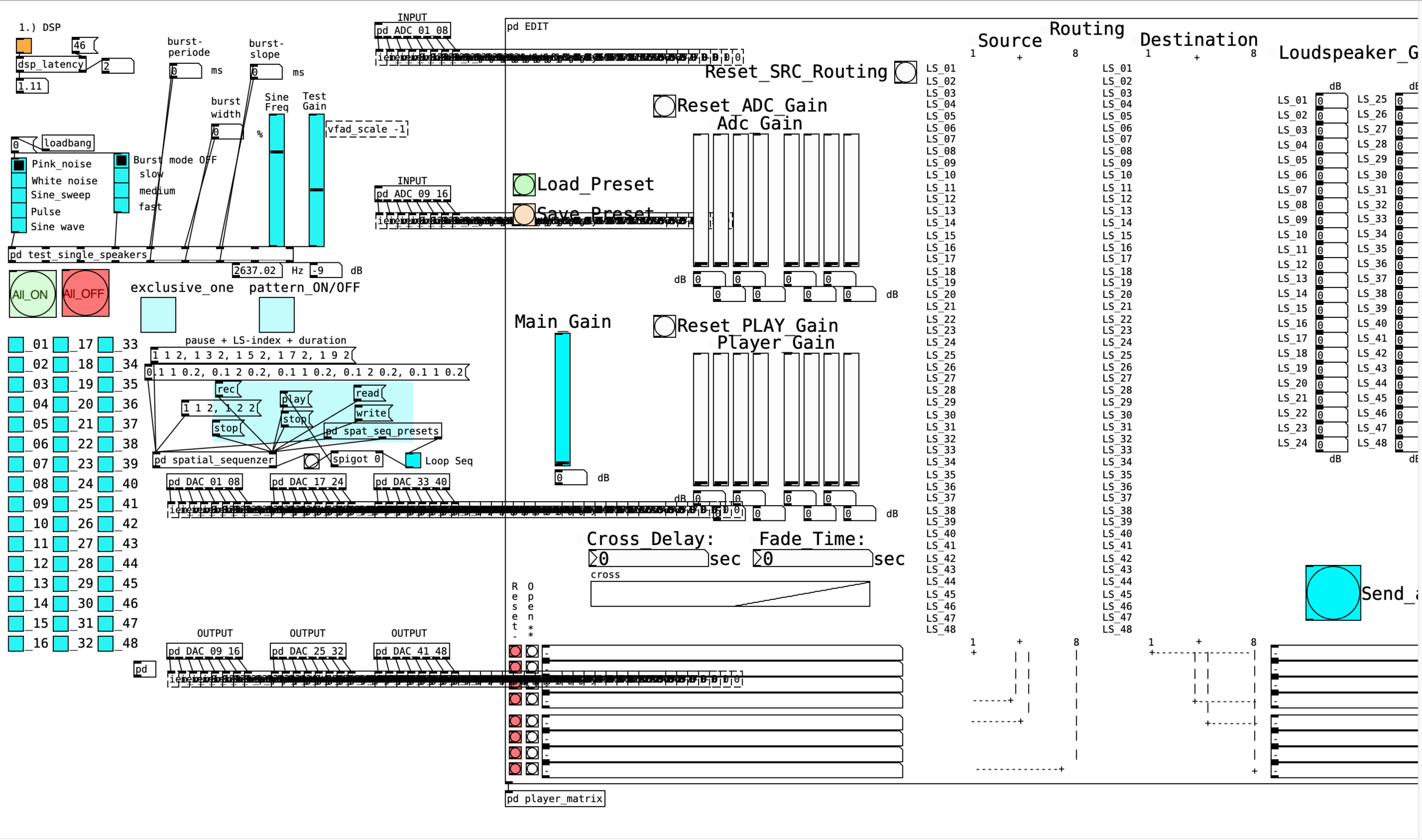 The software for {kA} is based on PD and SC3 provides versatile modules for sound file playback, sound synthesis and processing, signal routing and spatialization as well as recording and documentation.