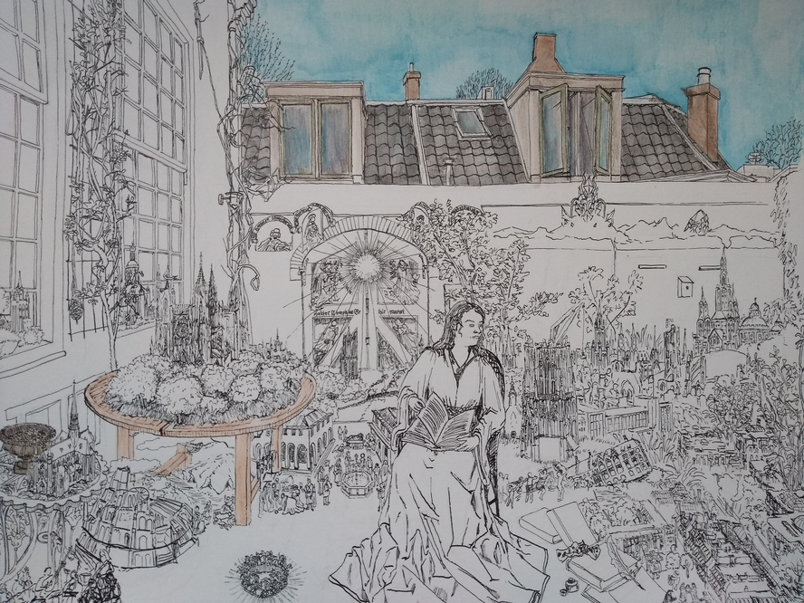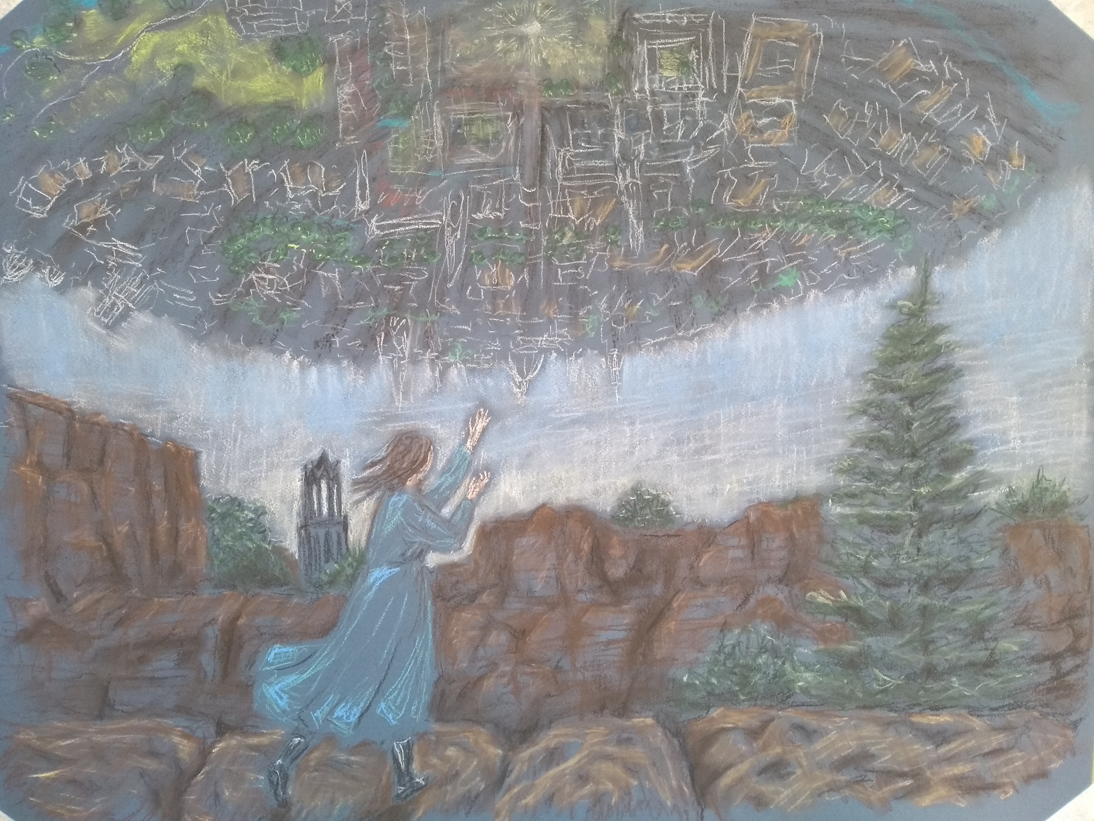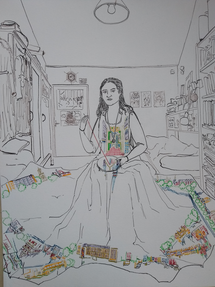 In my drawings, I investigate the ways in which the surroundings and places in which I live have effect on my life. As an Art History student, I love to travel across the country and visit cities and museums. In these days, this is almost impossible and I spend my days staying at home, remembering places I have visited. However, the contrast between the ‘real’ and ‘remembered’ world still remains present, as can be seen in Garden and Robe. In Overcast, the ‘old’ world, which is represented by the unreachable floating city, keeps following me and casts a shadow on my life, as I wander through a city which has turned into a rocky desert because everything is closed.