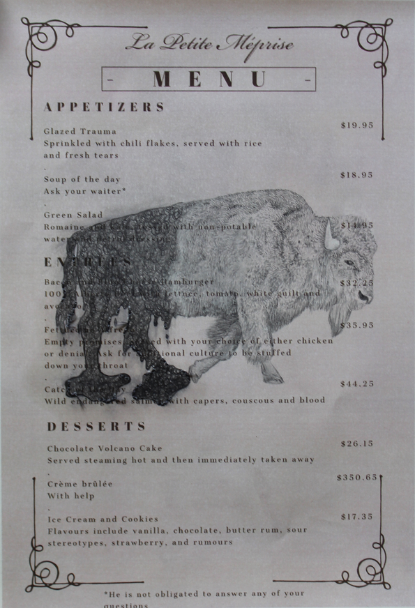 This piece reflects on the Indigenous relations within Canada, how they have changed, and how they have not. Each piece interconnects the past and the present. I am a non-Indigenous Canadian citizen and working on this piece forced me to grapple with my national identity, and my relationship with my country and its history. As an artist, I believe it is important to dive into subjects that people refuse to look at or acknowledge simply because the past and even present is hard to accept. Canada has installed a Truth and Reconciliation Commission to address the treatment of Indigenous peoples, however, sometimes society would rather have reconciliation, without looking at the truth first.