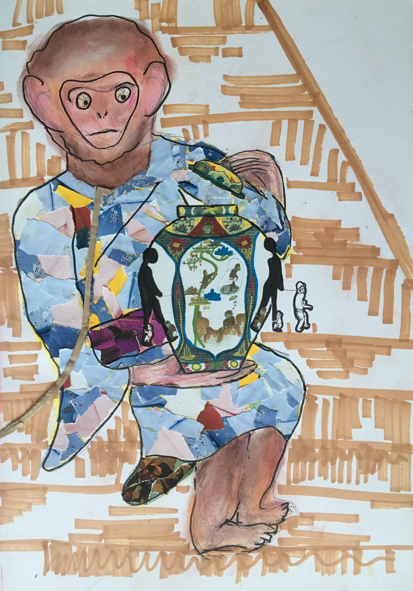 The relationship between humans and animals has always been a fascinating one, even more fascinating when the animal is depicted as a human. An article from Rene Ebersole and Jasper Doest (photographer) in the National Geographic (March 2020) sparked my interest and inspiration. I decided to experiment with the image of monkeys (Macaque) in Japan. On the one hand the Macaques are seen as holy animals but on the other hand they are treated as slaves for entertainment and are even seen as pests. By using different materials such as oil pastels and soft pastels in opposition, as well as paper collages and pen, I hoped to illustrate this duality.