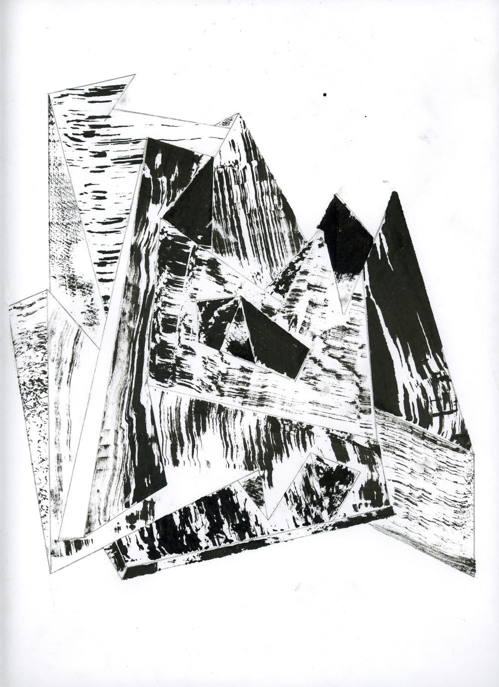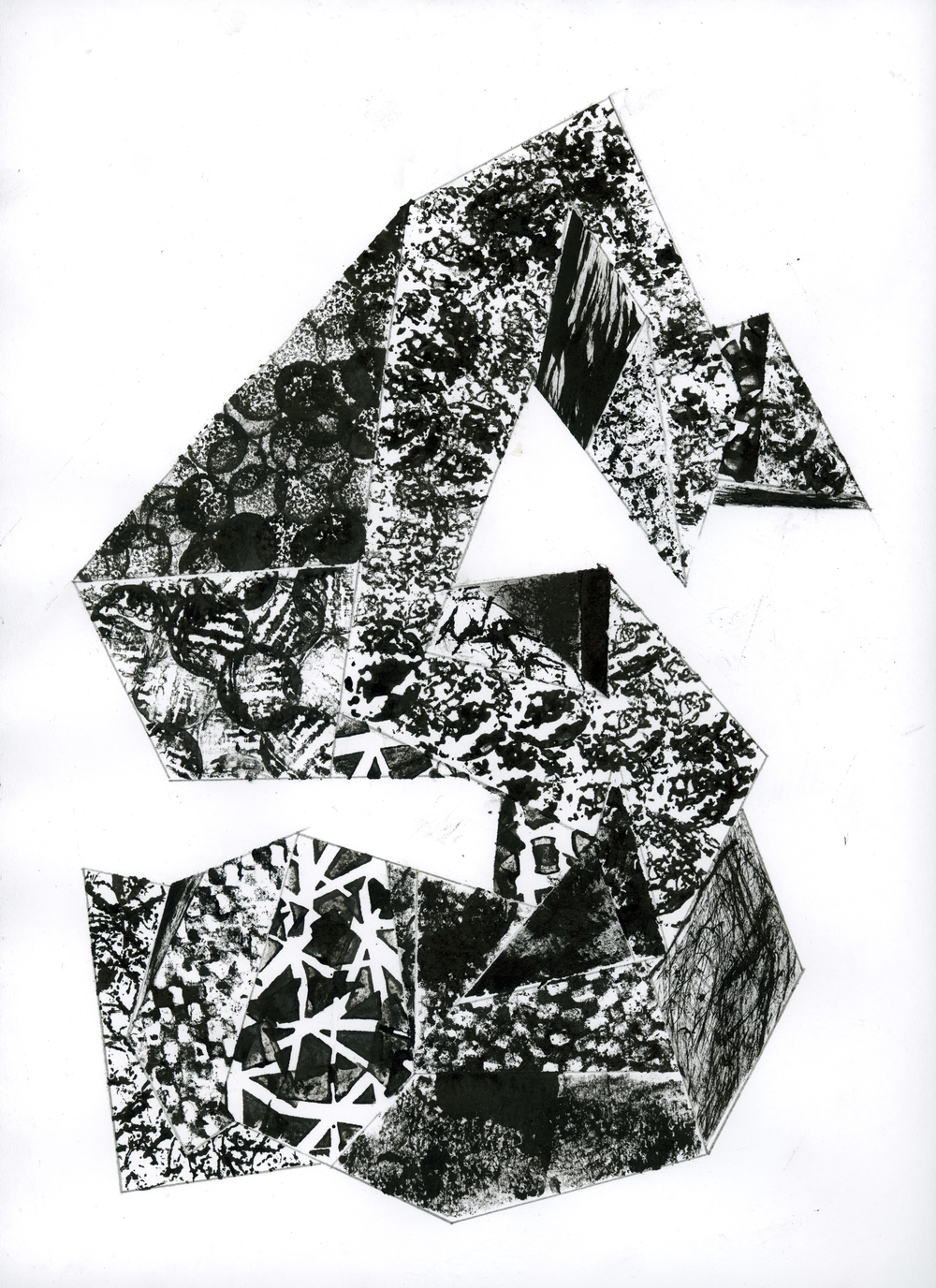 As I would normally prefer free hand drawing, I decided to try something different and more technical for this assignment: Perspective drawing. I performed multiple studies in which I experimented with a multitude of vanishing points, the horizon would be projected to all sides of the paper. The first drawing is constructed by a myriad of randomly distributed vanishing points. The studies two and three contain, respectively, twelve and sixteen vanishing points. In the following two studies, I experimented with adding shaded sides. The sixth study consists of a collage in which I used different threads and Eastern ink to then drag and create patterns. In the last two studies, a similar process was employed using stamps.