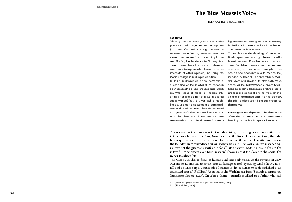 Is it worthwhile reaching out to organisms we cannot communicate with, and that most likely do not need our presence? How may we listen to critters other than us, and how can this make sense within urban development? In seeking answers to these questions, this essay is dedicated to one small and challenged creature – the blue mussel.