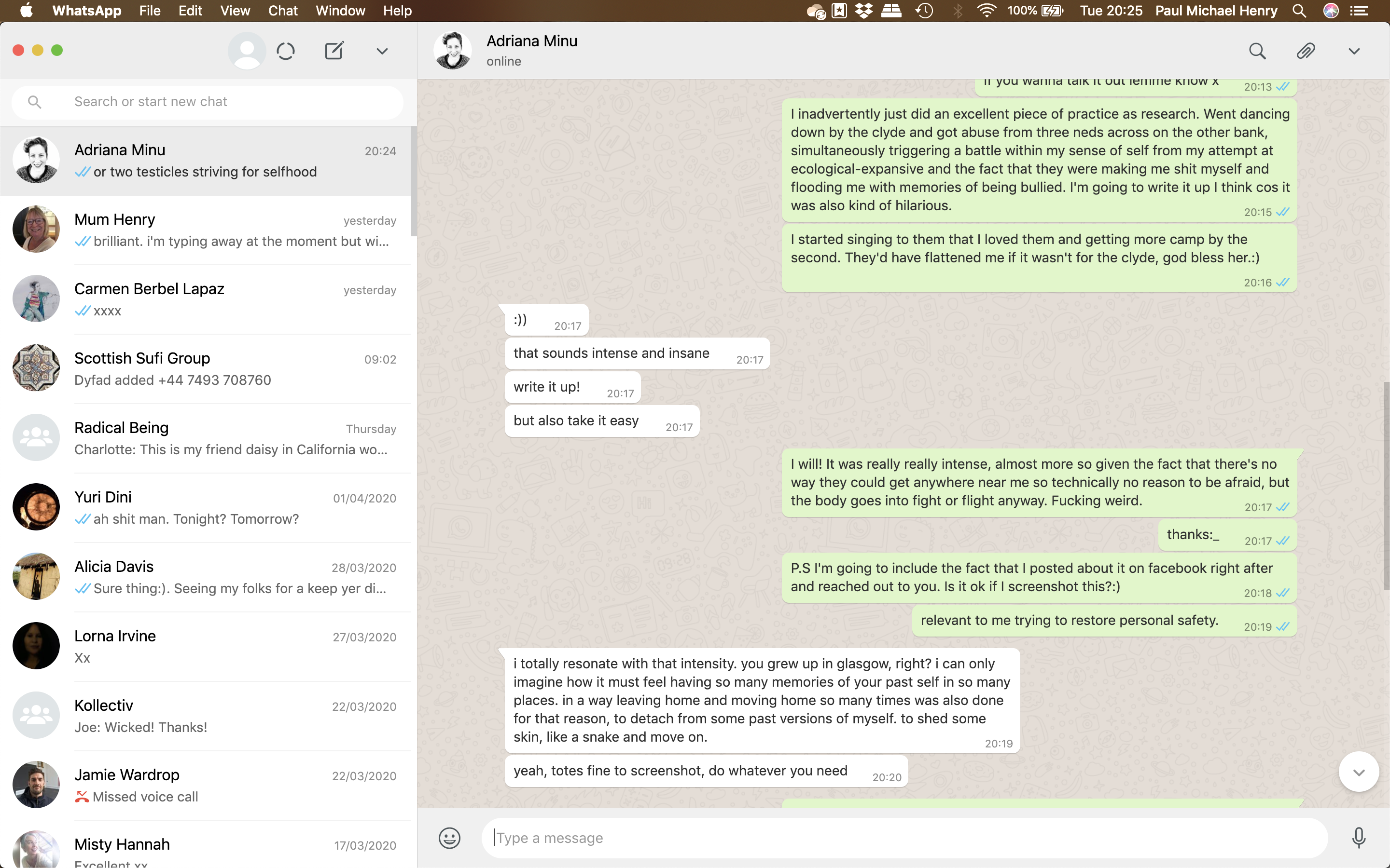 We have the following exchange. You can see me warming to the possibility of expressing how intense it was once she gives me the all clear, and my insistence on humour to maintain my easy banter with her and calm myself down: