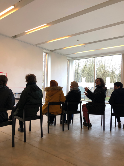 Reflection circle: inside the gallery space we place chairs in a circle-shape to share with the group our own embodied experience based on the (co-created) walking experience.