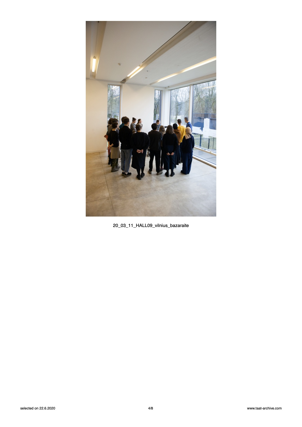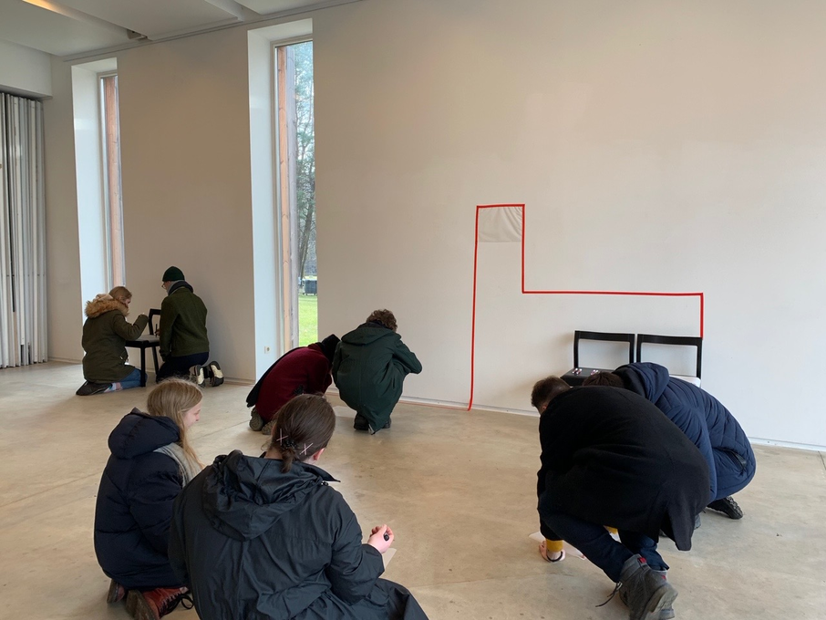 Curatorial intervention in the gallery space: in the middle of the space chairs are placed in a circle. At the left-hand wall (at the opposite of the Hall-timeline) there is one chair placed, with a red taped frame on the wall around it. We immediately start the new created walking performance by searching a place to sit on the chairs, and wait blindfolded till they come ask us to follow. The intro subgroup makes pairs to start the walking performance. One person guides the other one through a self-chosen trajectory. Another duo interacts with the first duo, by choosing stopping points to communicate non-verbally. When the duo's are back at the starting point of the trajectory, the pairs change their role. The outro group invites the participants to visualize their trajectory on a piece of paper, and write some words down to express their embodied experience.