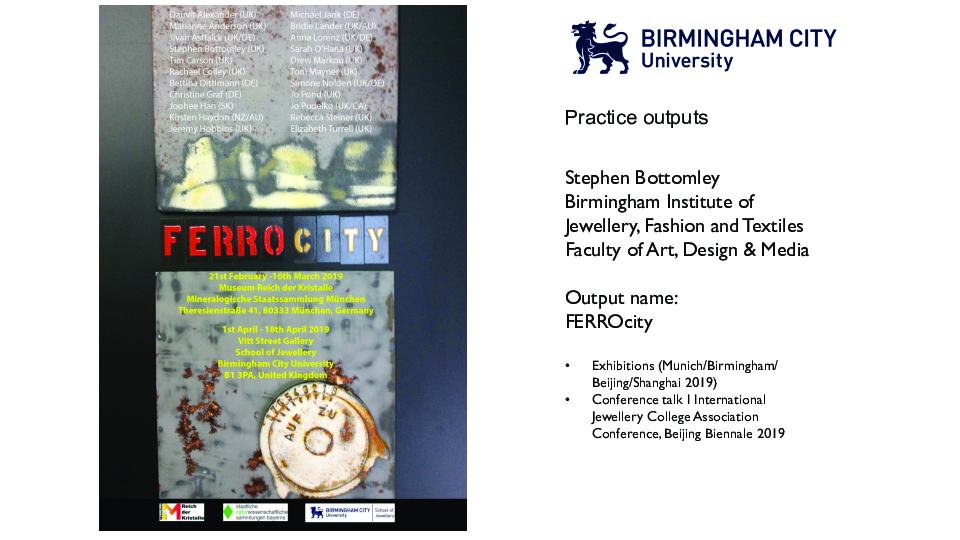 The exhibited outcomes were; 'Jewellery and objects by twenty-two contemporary makers displayed alongside gemmological samples and photography that explores the interpretation and influence of Iron as catalyst, material and fundamental element of life. The selection of contemporary metalwork and jewellery, ranging from steel vessels to recycled iron nail jewellery, presents a range of approaches to a fascinating and familiar material. The exhibition includes work by ten practicing artists and academic staff from Birmingham’s eminent School of Jewellery and ten invited international artists, as well as work by both curators. The micoscope photography has been commissioned from the school’s Gemmology department and captures the transformative effect iron has on the colouration of gemstones'.