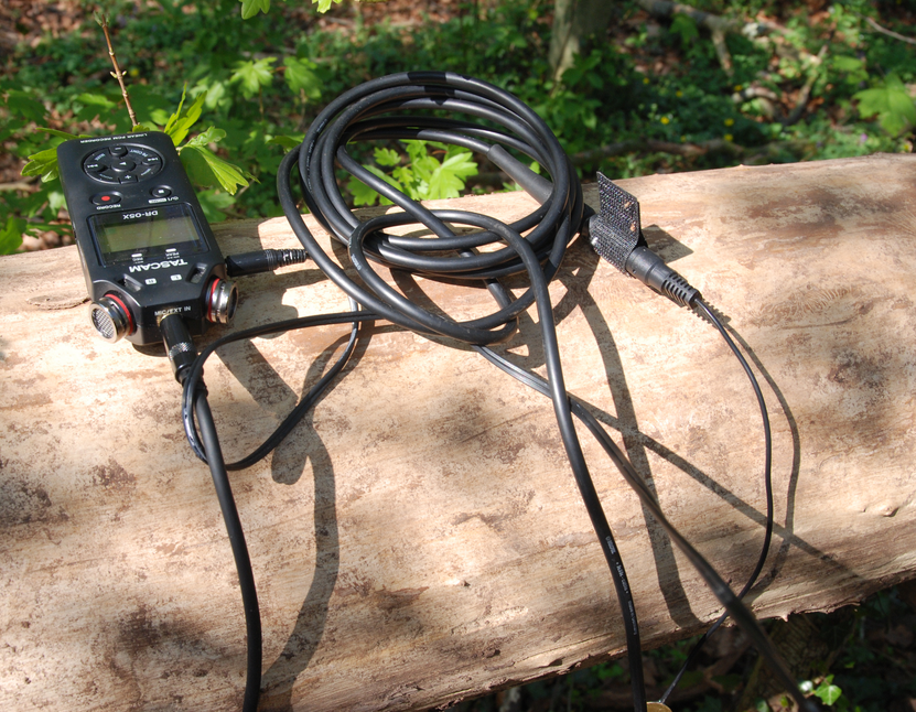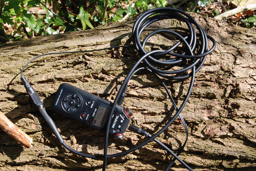 The next step was to record the sound inside the holes of the tree with an external condenser microphone connected to the recorder (condenser microphones pick up sound in a 75-150-degree cone, making them ideal for recording a specific source of sound). First, I inserted it into a small hole close to the first contact mic recording. Then I lowered it into the hollows of the two stumps. At first, I was awestruck. I could hear the wind! I imagined the wind entering the wood through holes in the surface and passing via a network of tunnels until it reached the microphone. I saw the trunk like an enormous flute, with each of its holes modifying the wind to a different pitch. It eventually dawned on me that what I was hearing was not the wind through the trees, but the wind being picked up by the internal microphones of the audio recorder outside of the tree.