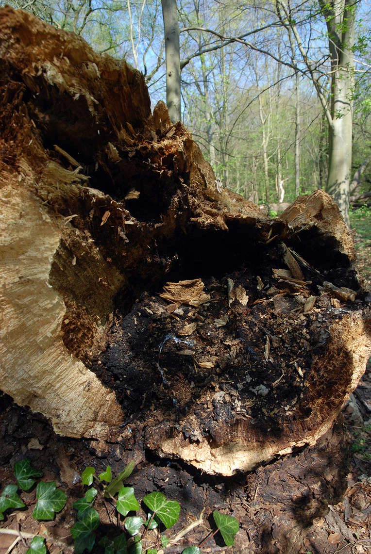 From the recordings I could gleam that the base of Fallen Tree A would be my best bet for a sound-based intervention in the wood. Its sound was the clearest. Around that point were also a collection of holes going into the trunk, indicating hidden chambers. Further, I could speculate on the development of rot in the trunks. If I was right in assuming that the rot spread from the base of the tree, then the wood would be denser and less decayed towards the top. The recordings of trunk B reaffirmed me, with dense and flat sounds. The breaking point of the fallen part of tree A is riddled with holes made by the rot, but not in nearly as a developed stage as its corresponding stump. A person could sit inside the hollow of the stump. One could barely put a hand into the breaking point of the fallen tree (figure 21). I could only imagine the cavities would be smaller further along the trunk.