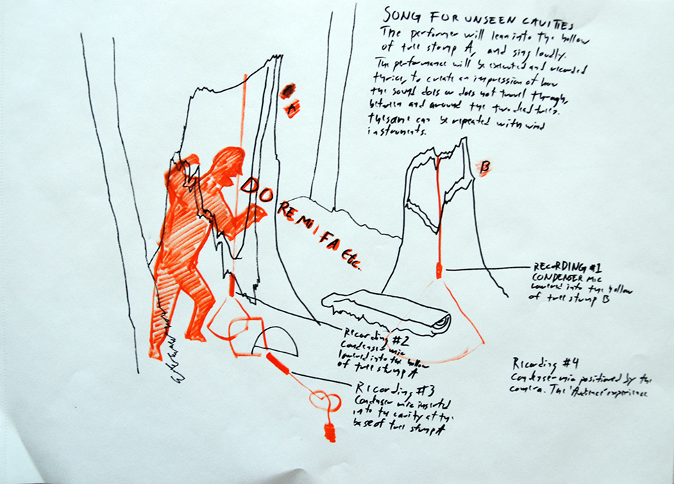 In Song for unseen cavities I planned on singing into the stump of Tree A. I wanted to find out how sound travelled in and around the trees. The action would be documented with video and sound recording. I would repeat the song four times, with an audio recorder in different locations each time. The frame of the video would focus on the location of the recorder. The locations were the inside the stump of tree B, inside the stump of Tree A, where I was singing, then in the small hole at the base of Tree A and finally at a distance together with the camera positioned to show an overview of the scene.
