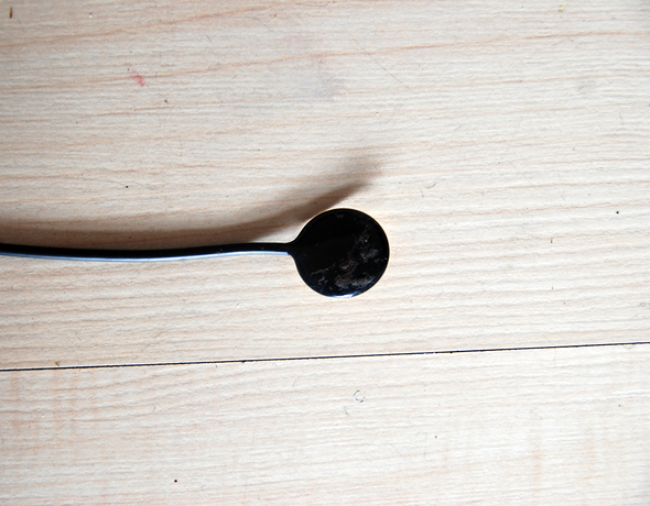 In Rot Dirge 1&2 I intended to attach violin strings to two different locations on the trees. The first being the base of the fallen part of Tree A. My recordings with the contact microphone lead me to believe that it was the spot most optimal for conducting sound. The second location was on the stump of Tree B. I was curious if the size of its hole would somehow amplify the sound. To attach the strings, I would drive nails into the wood on one end, and on the other drill holes in which I would insert tuning pegs. I planned on using a bridge I had made for another instrument to conduct the sound into the tree. With the strings in place I would improvise a tune recorded in a similar way to the singing.