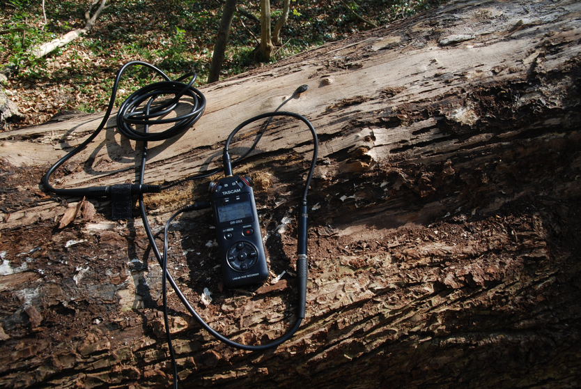 Eventually I walked back to the site and found it empty. I could begin. As shown in the plans for recording, I began by placing a contact microphone on a few spots along the length of the fallen trunks (contact microphones pick up the vibrations going through material, instead of vibrations in the air). With a headset plugged into the recorder I spent the first few minutes of recording by listening to each spot. I heard nothing. It was slightly discouraging. Afterwards I proceeded to knock on the wood around the microphone with a stick. I imagined it would tell me something about the way the wood conducted sound. I did this on five spots.