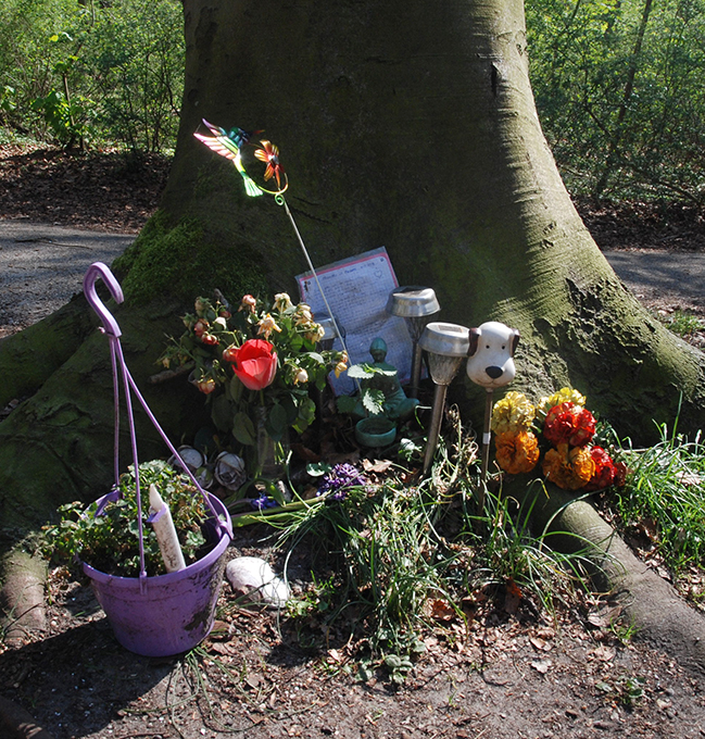 A group of children were running around the trees when I arrived. They balanced on them, shouted into the tree stumps and beat the logs with long branches. I hesitated for a moment. They were doing exactly what I had come there to do. It made me glad to see that the trees appealed similarly others as well. Not wanting to linger around until they left, I trailed off on another path until I found a bench where I could wait. By the base of a tree next to the bench someone had scattered a collection of objects. Flowers, small lanterns, a miniature statuette and an illustrative plastic dog head on a stick (figure 20). There was a laminated note among them. On grid paper, as from a math book, big handwritten letters spelled Six months in heaven. A grave. I was looking at the burial site of a family pet.