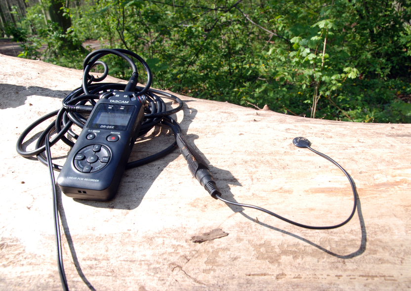 The next step was to record the sound inside the holes of the tree with an external condenser microphone connected to the recorder (condenser microphones pick up sound in a 75-150-degree cone, making them ideal for recording a specific source of sound). First, I inserted it into a small hole close to the first contact mic recording. Then I lowered it into the hollows of the two stumps. At first, I was awestruck. I could hear the wind! I imagined the wind entering the wood through holes in the surface and passing via a network of tunnels until it reached the microphone. I saw the trunk like an enormous flute, with each of its holes modifying the wind to a different pitch. It eventually dawned on me that what I was hearing was not the wind through the trees, but the wind being picked up by the internal microphones of the audio recorder outside of the tree.