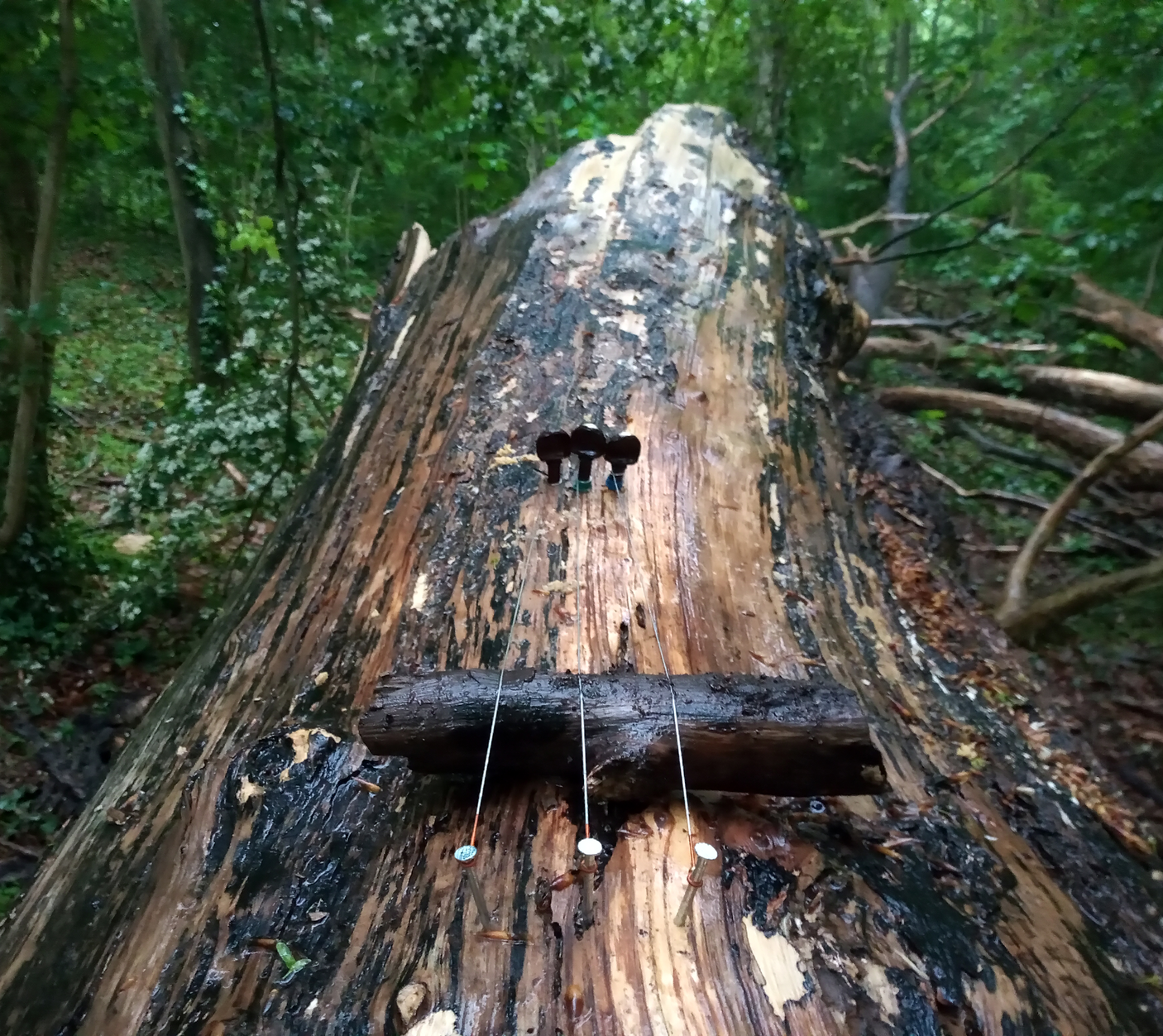 It was already beginning to rain when I left my house in the morning. A soft drizzle. I brought with me three violin strings, tuning pegs, nails, a hammer, a hand drill, a violin bow, a microphone stand, an audio recorder, a contact microphone, a tripod and a video camera. The dead trees glistened with rain. I had never seen them like that before. Only on dry days had I visited them. They appeared dark and slimy, not as graceful as I remembered them. As I was setting up my equipment the rain seemed to have passed. Should it return, the leaves would provide ample shelter. The nails slipped into the wood. The holes I drilled for the tuning pegs were surprisingly sticky and held the strings taut.