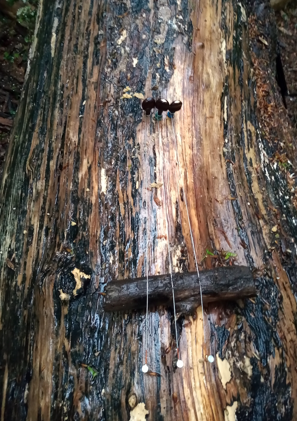 When I was younger, I recall being under the impression that rot was caused by rain and humidity. Rain makes clean surfaces gleam, and it makes the dirty seem even more so. A wet stain looks viscous and living. The soft and soggy wet undergrowth of the forest merges into a pulp. It seems to decompose. Last year I saw a black stain on a log, and I was told it was the imprint of a dead rot. It looked like a bruise. The idea of rot as a living network that could spread and die, affecting the growth of forests, inspired in me a curiosity that would lead me to the dead trees. Rot Dirge was to be the conclusion of a project that had yielded more introspection than material results. A dirge is a piece of music made in lamentation of the dead (Merriam-Webster). With the violin strings I wanted to pay tribute to the dead trees. Instead I heard the only dirge fitting of a forest, the dirge of the roaring rain. I had to leave.