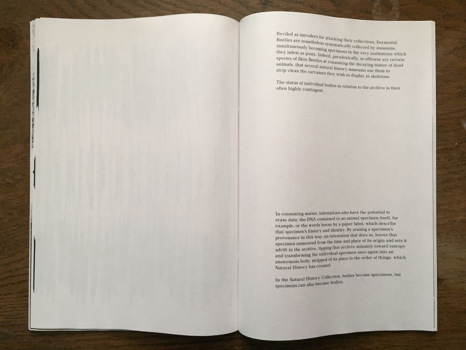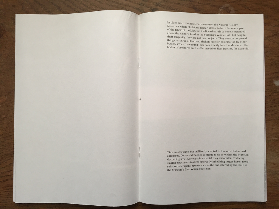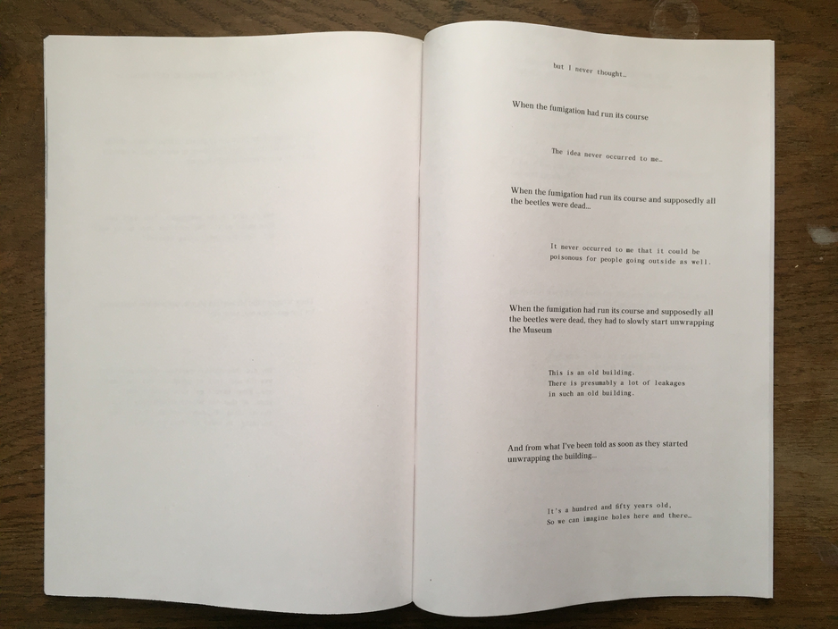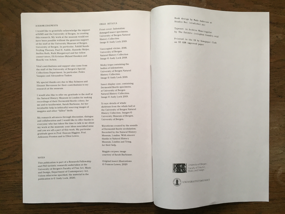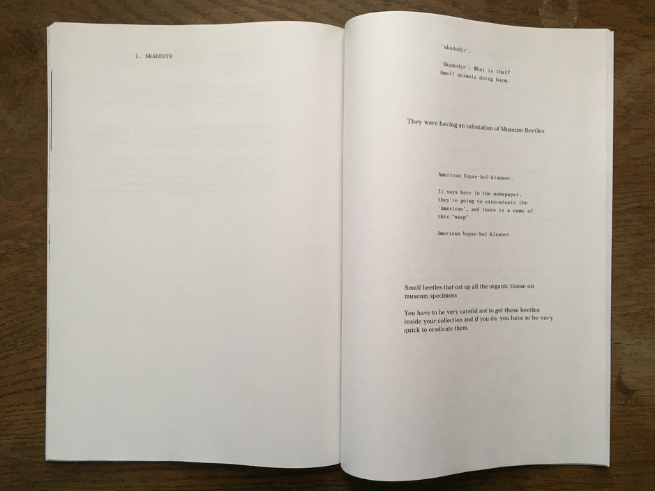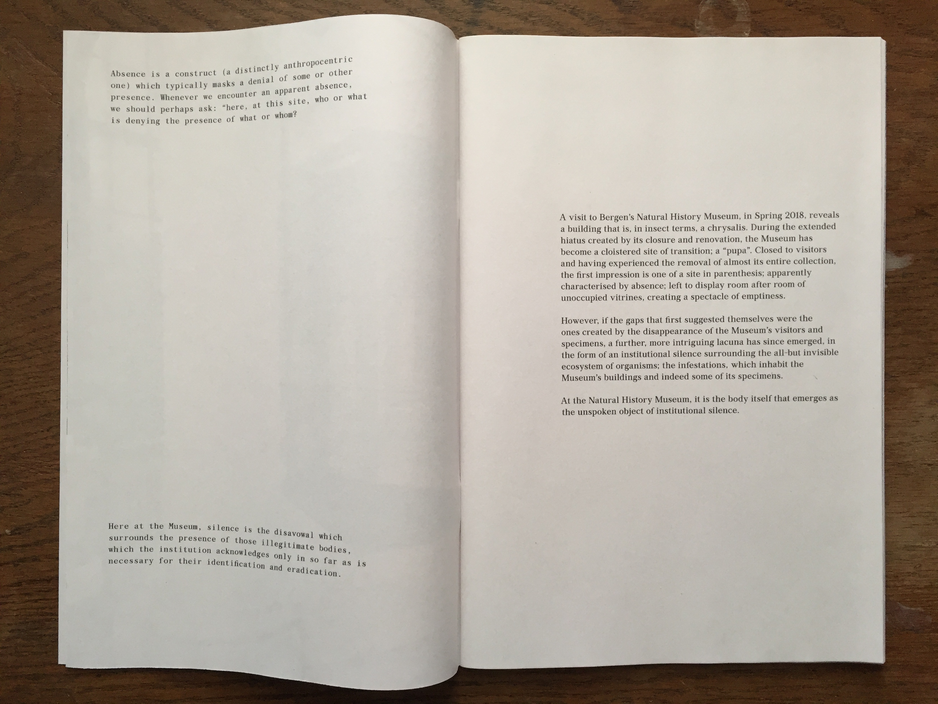 Throughout summer and Autumn 2020, I continued to work on The Wrong Bodies an artist's book, based on my work at the museum. This book to be dispayed at the Bergen Natural History Museum. Working back and forth between the book and the final spoken-word performance helped to develop my writing about my discoveries at the museum.
