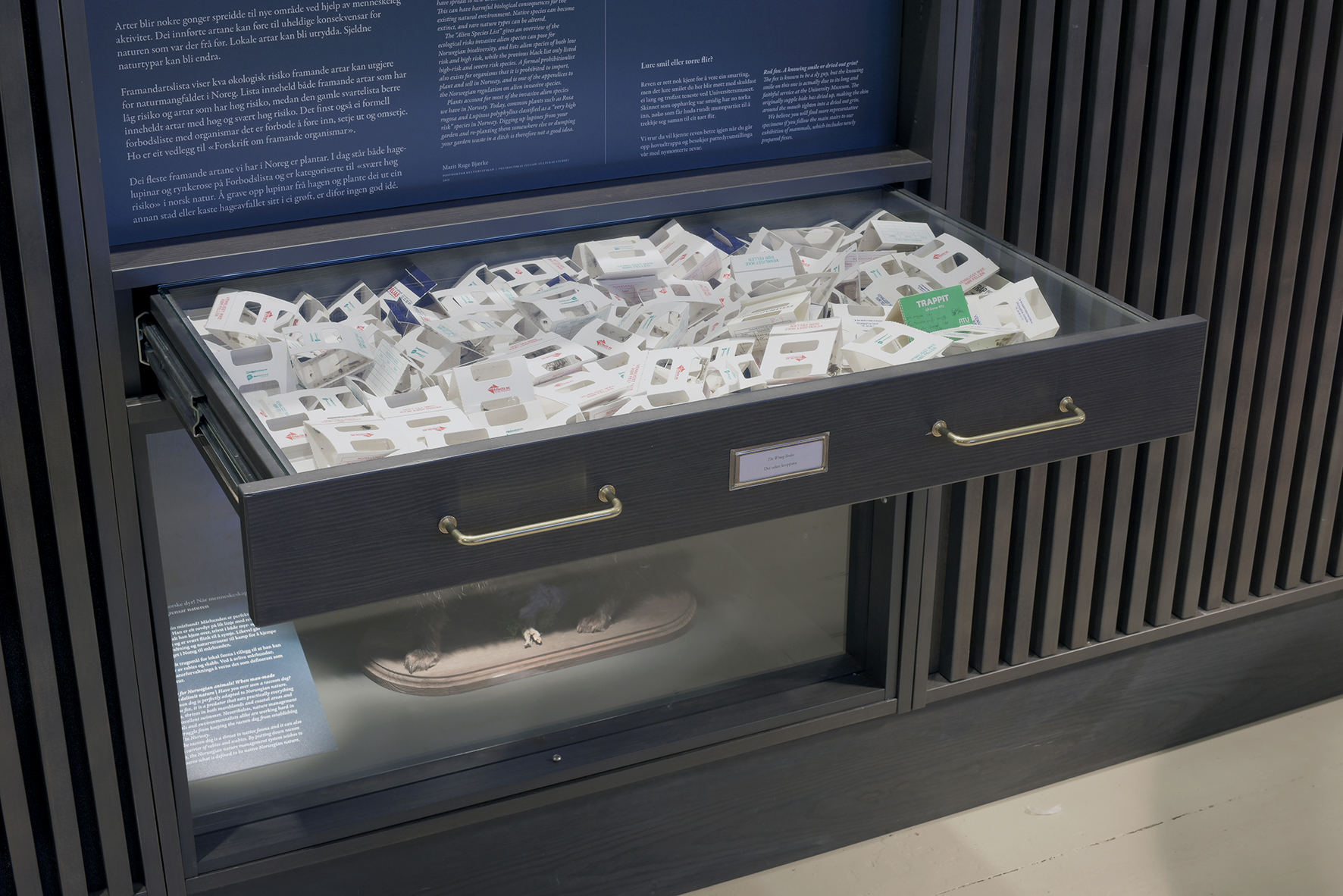 Above: The World Views Room at the Bergen Natural History Museum. The drawer containing The Wrong Bodies is in the background.
