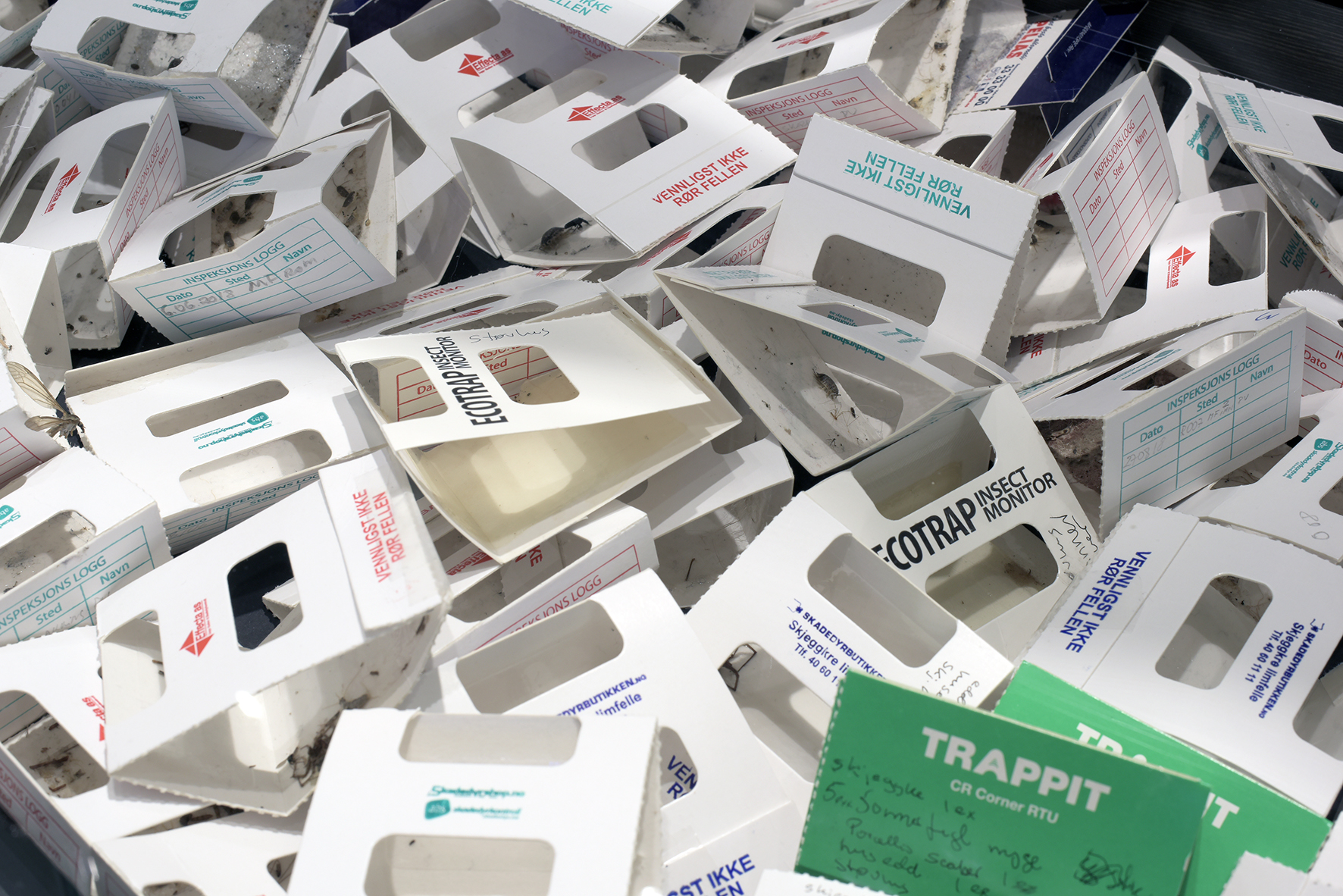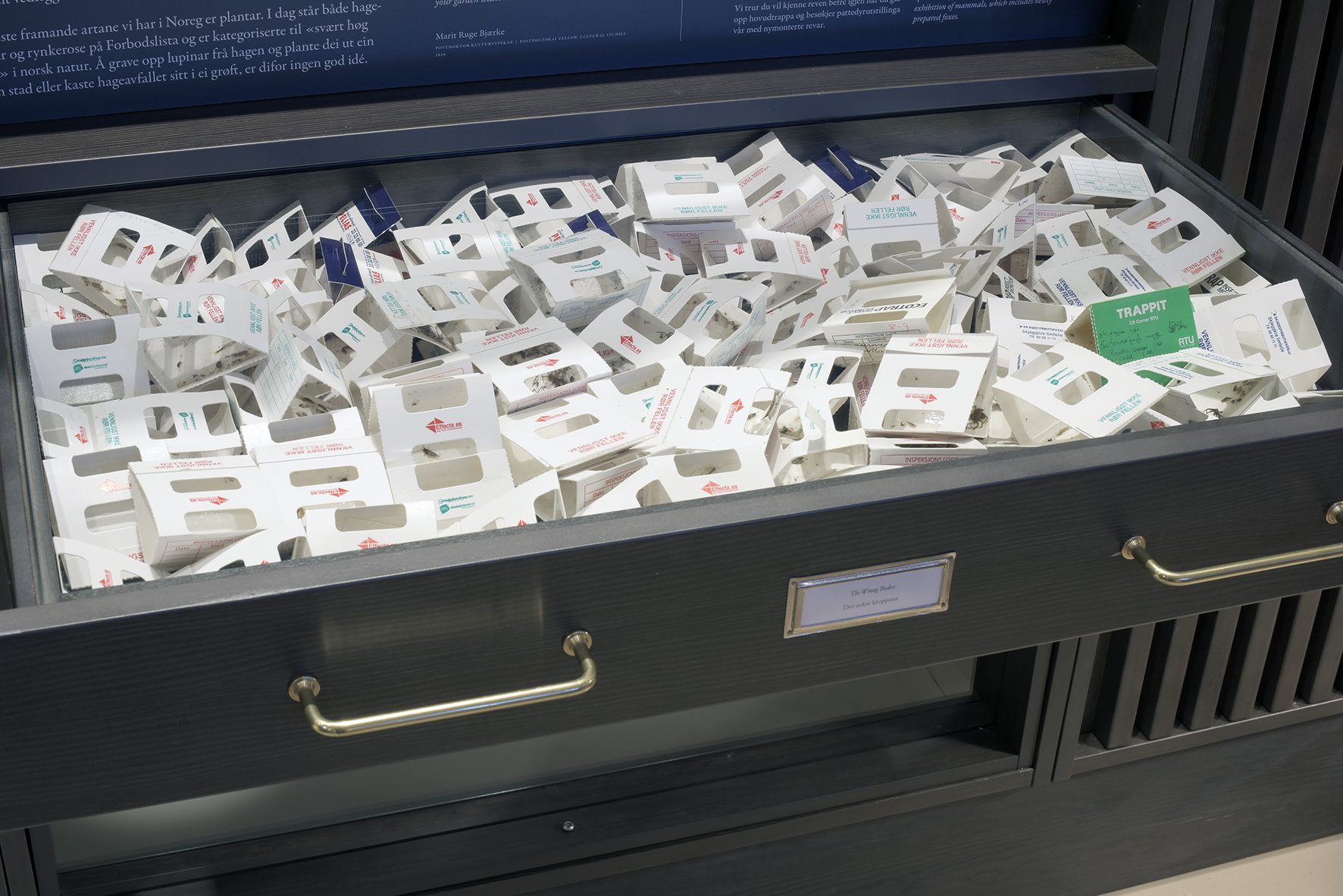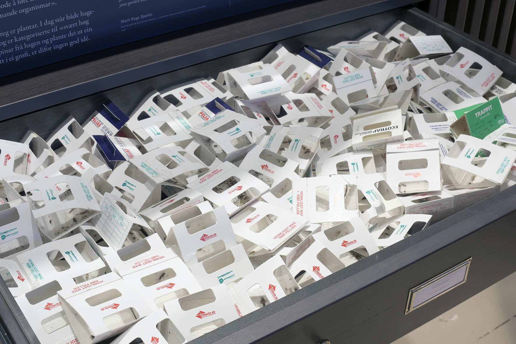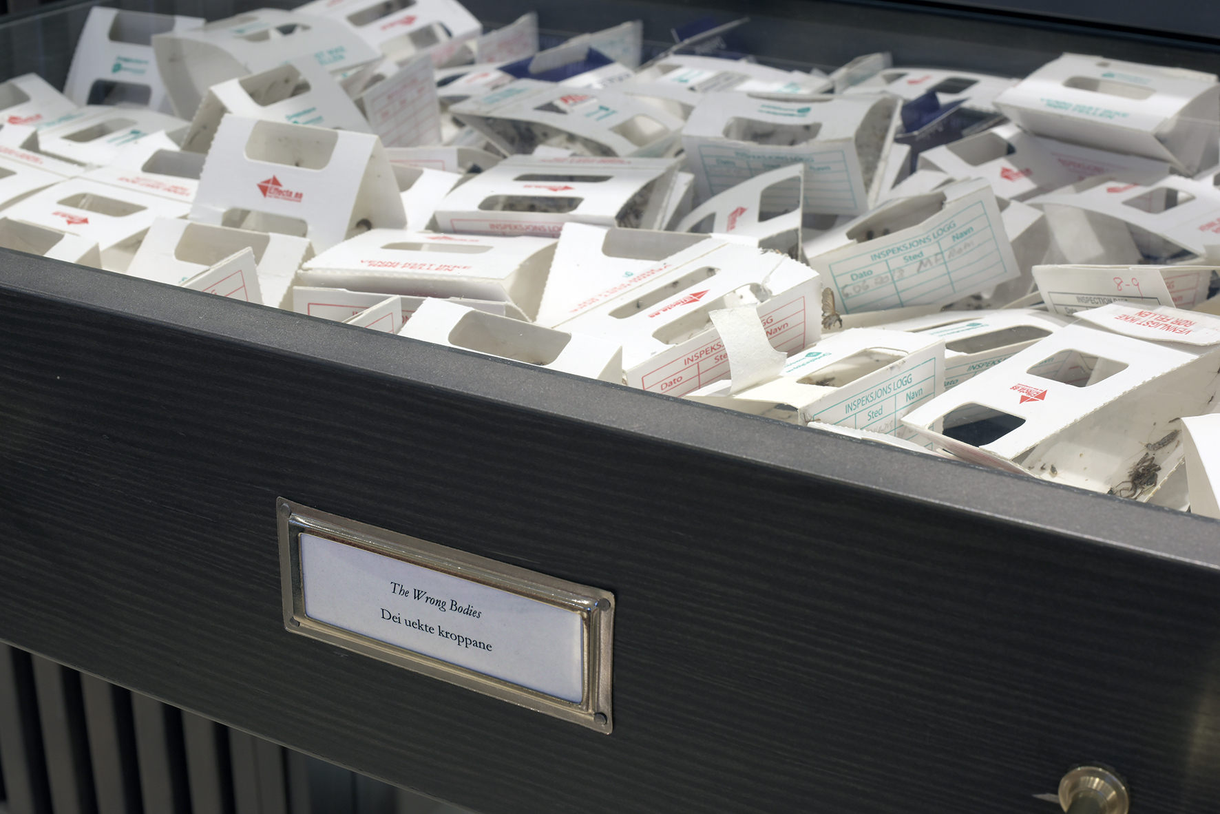 This is a work which I was commissioned to create for the World Views room at the Natural History Museum in Bergen. This is a room of exhibits dedicated to exploring questions of classification in the field of natural history. The drawer, labelled “The Wrong Bodies”, contains dozens of sticky traps, the small cardboard and glue traps that the museum uses to collect, classify and monitor not its specimens, but it’s pests; it’s “wrong bodies”. This act of classification creates a kind of “shadow collection” comprised of the museum’s illegitimate bodily presences: the mirror of its public collection of specimens.