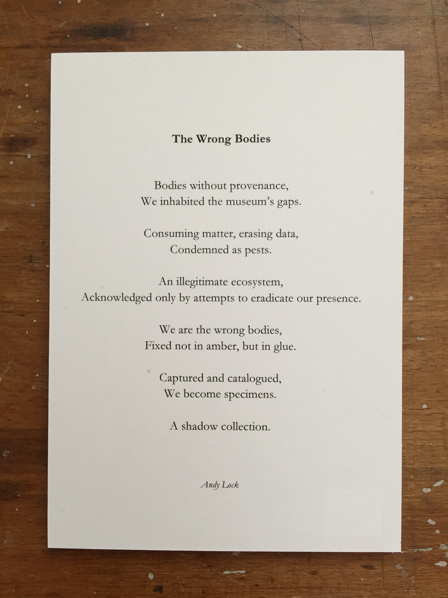 Having made the museum’s shadow collection visible, through the creation of the “Wrong Bodies” installation, I felt compelled to make them heard. As I worked with the bodies in the sticky traps, a parallel process began to emerge: the creation of a text which would accompany the bodies themselves, and as that text emerged, I realised that my own voice had metamorphosed into that of the bodies with which I was working.