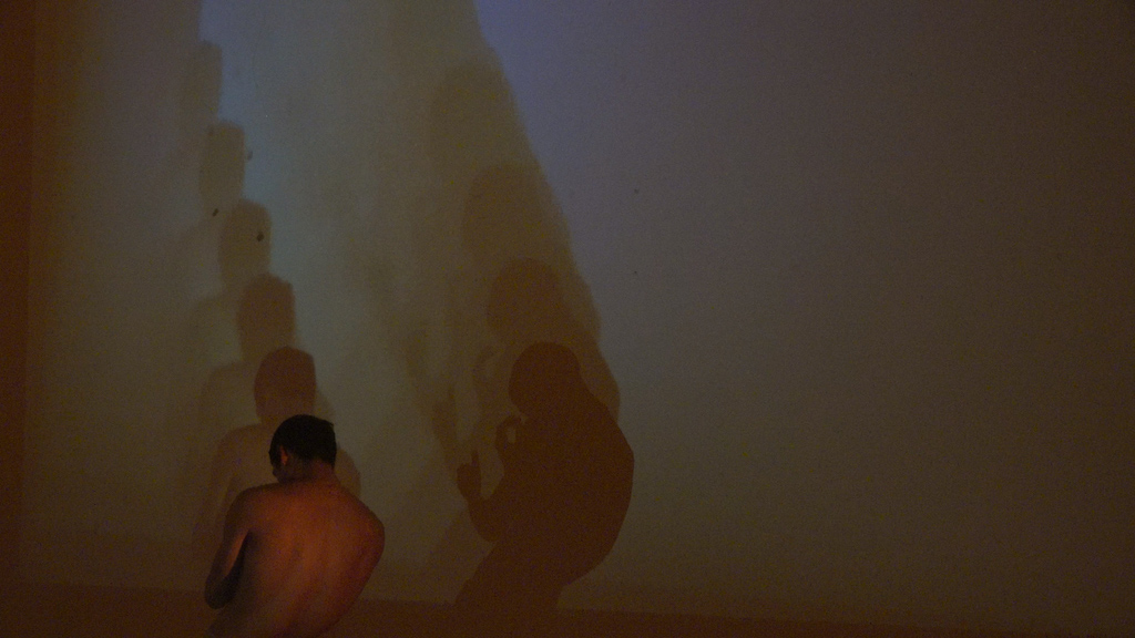 21:45. Die Türen öffnen sich und die Menschen betreten den Raum. Es gibt weder Stühle, noch einen markierten Bereich. Sie können frei entscheiden wie sie sich positionieren, ob sie sich auf den Boden setzen oder sich durch den Raum bewegen. Langsam stellen sich die Gespräche ein. Heiwa sitzt in einem der Fensterrahmen. Sie fängt an sich ganz langsam zu bewegen. Durch ihre Bewegungen entstehen Geräusche, die sich im Raum entfalten. Die meisten ZuschauerInnen befinden sich mit dem Rücken zu ihr und haben den Blick auf David und mich gerichtet. Sie schauen uns erwartungsvoll an. Mit der Zeit beginnen einige sich umzudrehen und nehmen sie wahr. Die Geräusche werden leiser, und andere kommen zum Vorschein. David sitzt auf einem Stuhl. Durch das Mikrofon an seinem Körper können wir seinen Herzschlag hören. Auch er bewegt sich langsam, fast wie in Zeitlupe. Nur wenn wir genau hinsehen, nehmen wir Veränderungen in seinen Bewegungen wahr. Dann beginne ich mich zu bewegen. Vorsichtig und bedacht. Wie viel Raum nehme ich ein? Jede kleinste Bewegung bringt Geräusche hervor. Mein Körper wird zum Instrument. Ein Instrument, das ich mit meinen Bewegungen spiele. Die Signale wandern durch das Mikrofon an meinem Körper zu Martin. Er verstärkt sie, verändert sie leicht. Ich reagiere mit meinen Bewegungen darauf. Die nächsten fünf Minuten bewegen wir uns langsam aufeinander zu. Manchmal verharren wir kurz. Stille. Leise ertönt ein Saxophon.