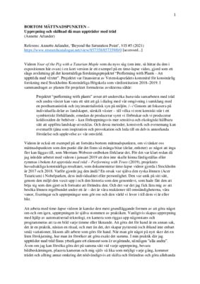 Videon är också ett exempel på att fortsätta bortom mättnadspunkten, om vi tänker oss mättnadspunkten som den punkt där det finns så många bitar (delar, enheter) av något att inga fler kan läggas till, som Merriam-Webster-ordboken förklarar det. För det var klart redan då jag inledde arbetet med videon i januari 2019 att den inte skulle hinna färdigställas eller rymmas i boken Att uppträda med träd – Performing with Trees (2019), projektets huvudsakliga konstnärliga resultatet, som dokumenterar time-lapse videor gjorda i Stockholm år 2017 och 2018. Varför gjorde jag den ändå? En orsak var själva den ryska lönnen (Acer Tataricum) i Nobelparken, dess individualitet eller personlighet. Den var unik på sitt sätt, genom den miljö den vuxit upp i och den historia som den genomlevt, som hade fått den att böja sig som den gjort och fortsatte att förändra den. Och det var det jag fick lära mig av att besöka lönnen regelbundet under ett år – det är våra reaktioner till omständigheterna, våra vanor, fixeringar och upprepningar som gör oss och den värld vi lever i till dem vi är eller blir.