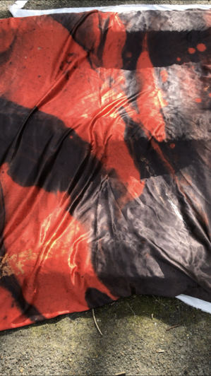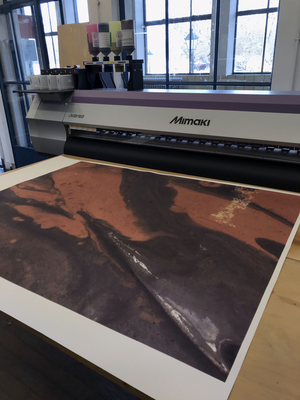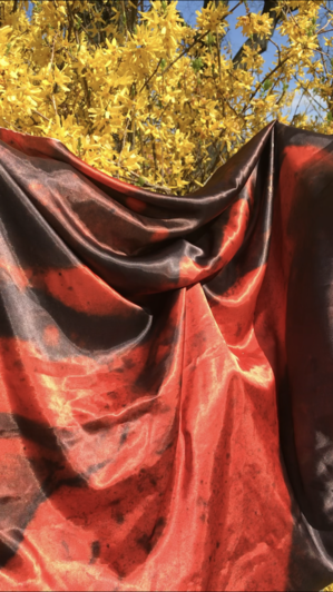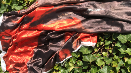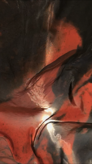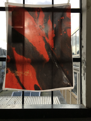 As its subject, the whole process of this project has been very fluid. Initially it started as an idea to find a way to “hear colour” originating from an archive of images of wet paint I have been collecting. I experimented with Photosounder (Every sound you've ever heard can be represented as an image and all possible sounds can be made from an image. Only Photosounder allows you to transform any sound as an image and to create any possible sound from an image.)1, but the results were not enough for me. I didn’t have control over the creation of sound, it was too flat, mechanical and scientific for my idea. Intuitively roaming around led to another aspect of this work, exploring different ways to represent this idea. I started with printing an image on fabric using sublimation printing technique. The image I chose had formal qualities similar to the ones sound has, such as: wavelength, amplitude, time, frequency and speed of wave. This is how the piece of fabric became the visualisation of sound. A next step was adding another layer to the whole idea and creating a suitable sound that’s a translation of wet paint... dripping...leaking...dropping...floating...flying...being...staying...swimming...diving... expanding...mixing...submerging.