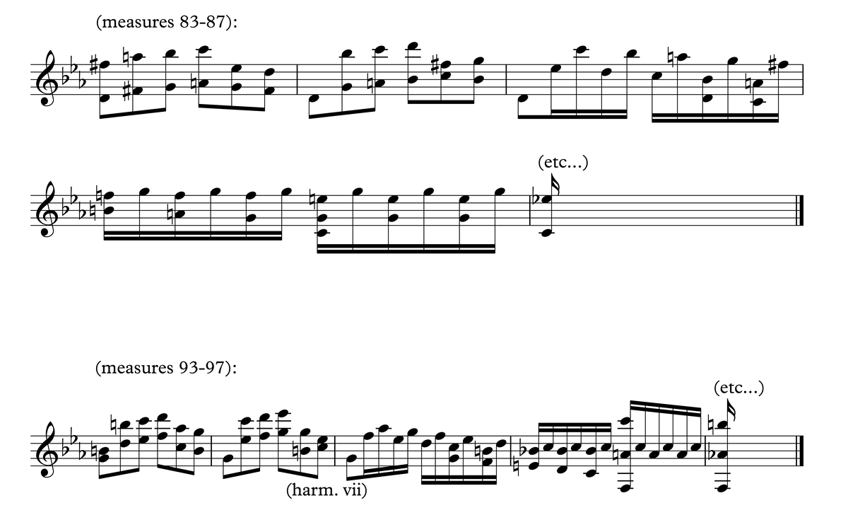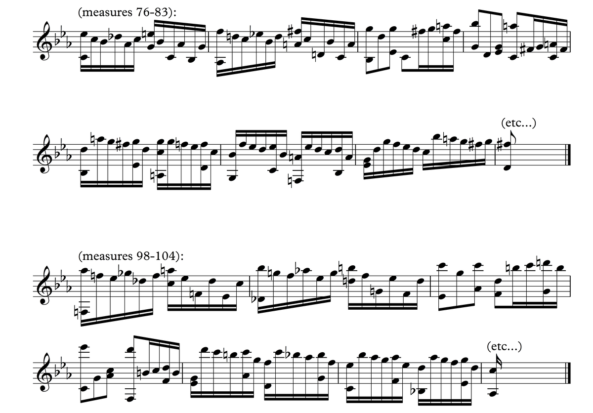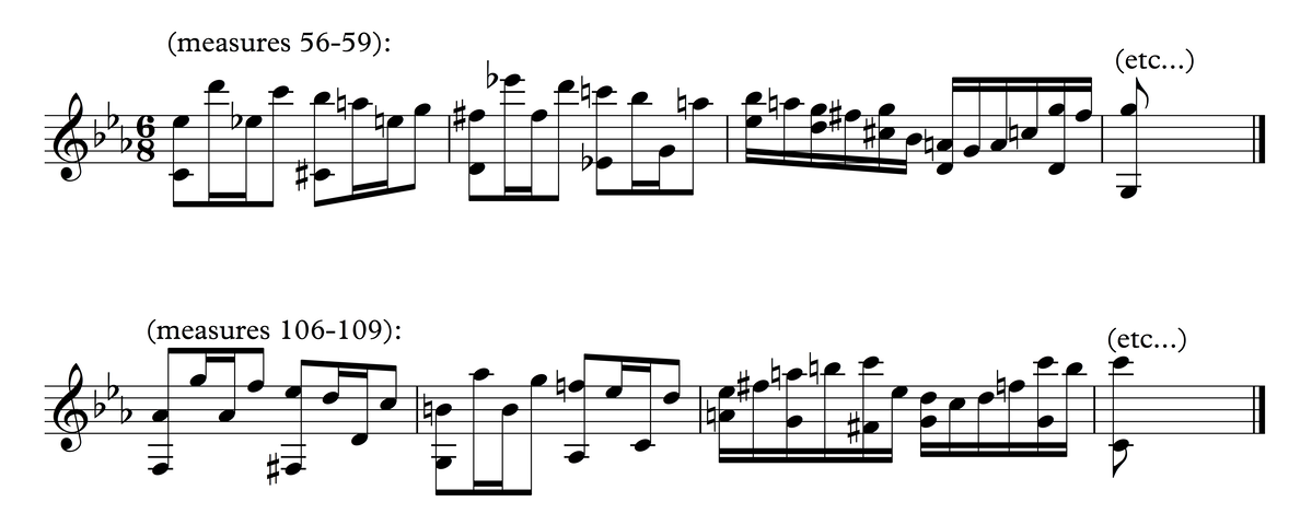 Ledbetter focuses here on passages that are, incidentally, problematic on the guitar bouzouki. It’s more or less impossible with the tuning at hand to create a replacement for thirds played in sixteenth-note mini-arpeggios in the lower voice, as Bach’s autograph demands. I have instead proposed the following simplifications, once again losing some of the textural riches that Gould mentioned above. The passages are roughly the same as the ones described by Ledbetter, and contain the same material in different keys; consequently, they need the same simplifications in order to appear as homogenously as possible. Here’s the outcome of the simplification process of the first two corresponding groups of material: