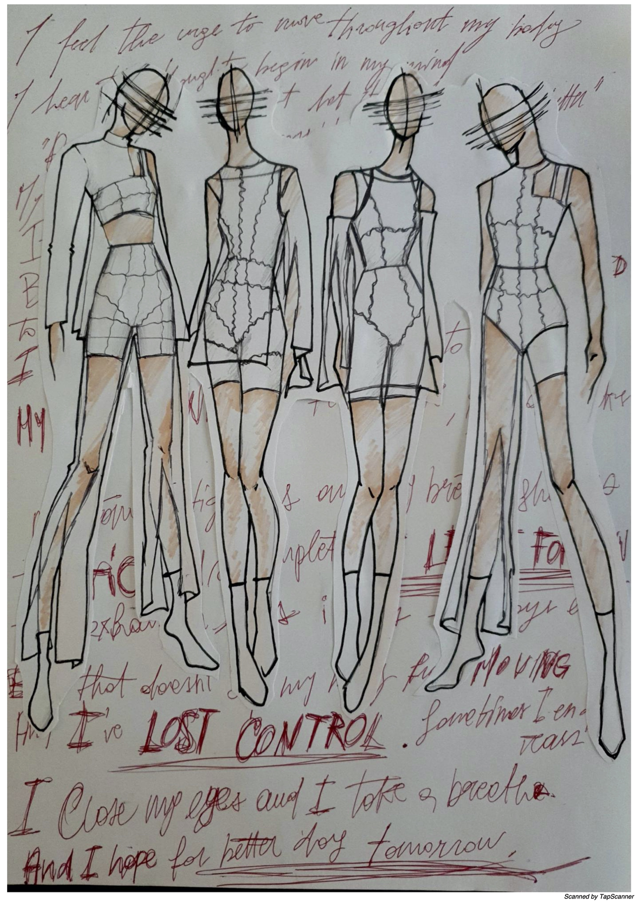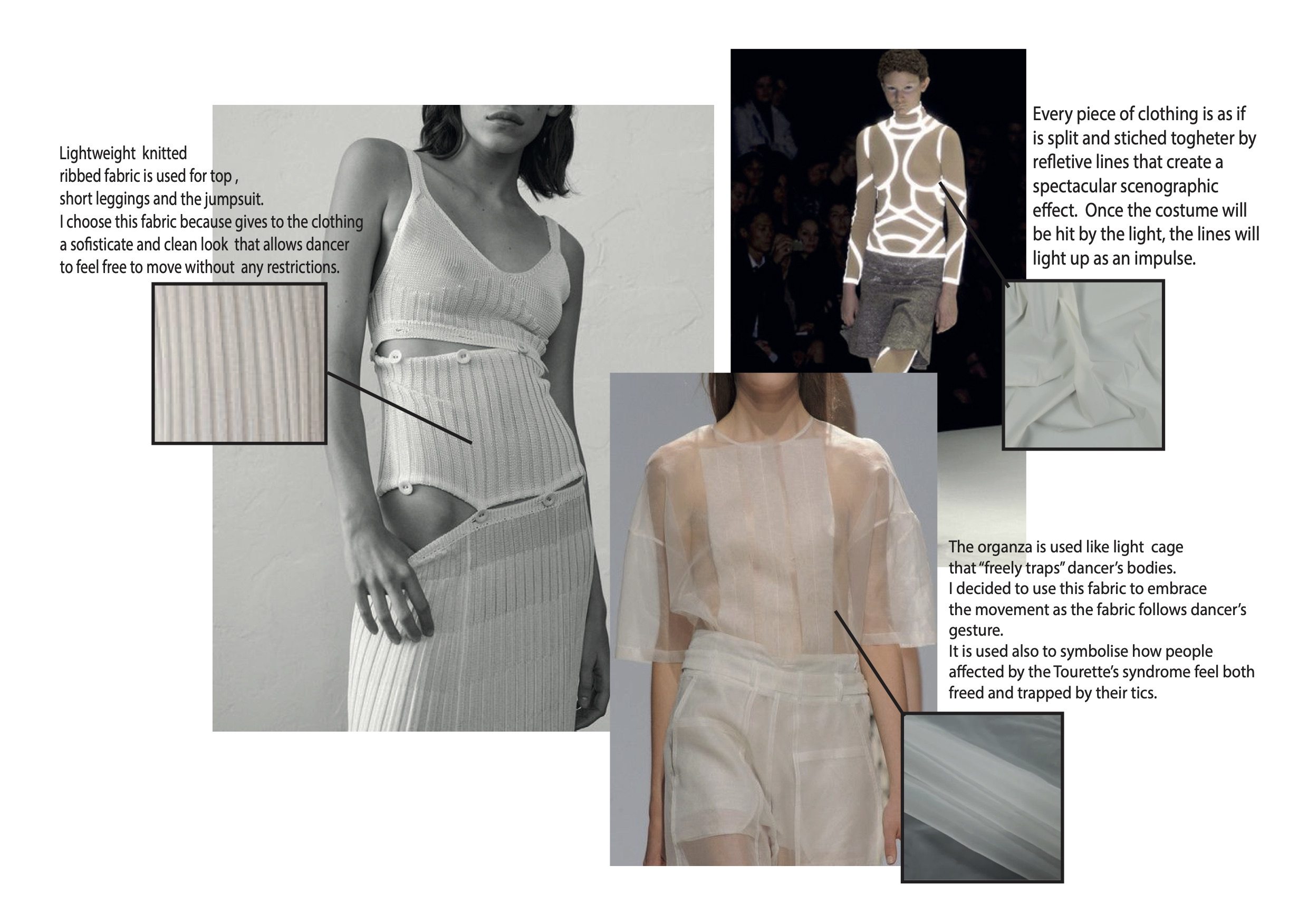 The dresses were designed by Fabiana Fabiano. She created four different costumes that are connected. The different layers used symbolises the various aspects of Tourette syndrome. Materials, design, and shade were discussed to find the best visual effect on stage.