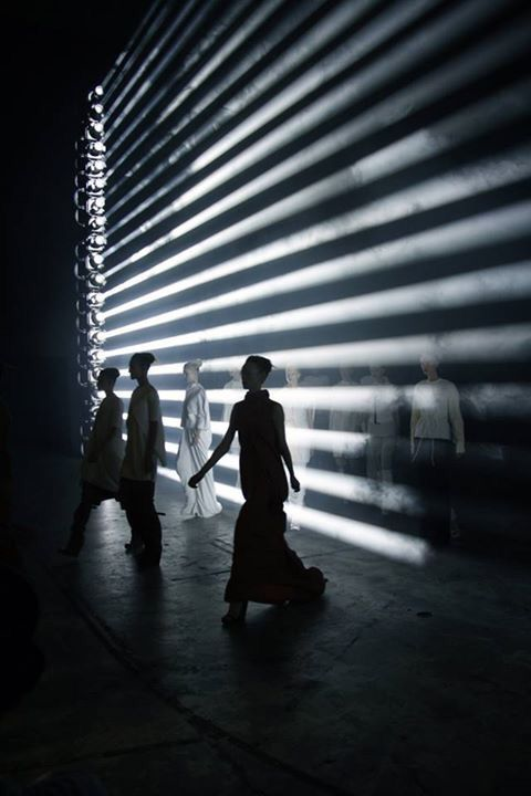 When the voice finishes reading the text, the dancers stop. They look at the audience and the lights go out. End of the scene.