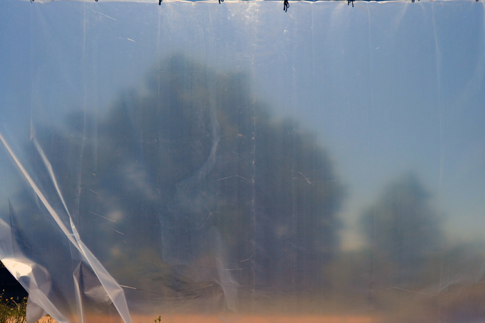 Backdrop (Experiment) is a series of tests carried out during a research residency in O Espaço do Tempo (Montemor o Novo, Alentejo, Portugal) in May 2016. It consists of a double outdoor test-installation and an indoor test-installation (including two video documentations from the outdoor installations). The project was eventually finalized and installed for the exhibition You Gotta Say Yes To Another Access in the Research Pavilion in the context of the 57th Venice Biennale. The installation is made of pvc film, steel elements for the construction of a temporary outdoor stage.