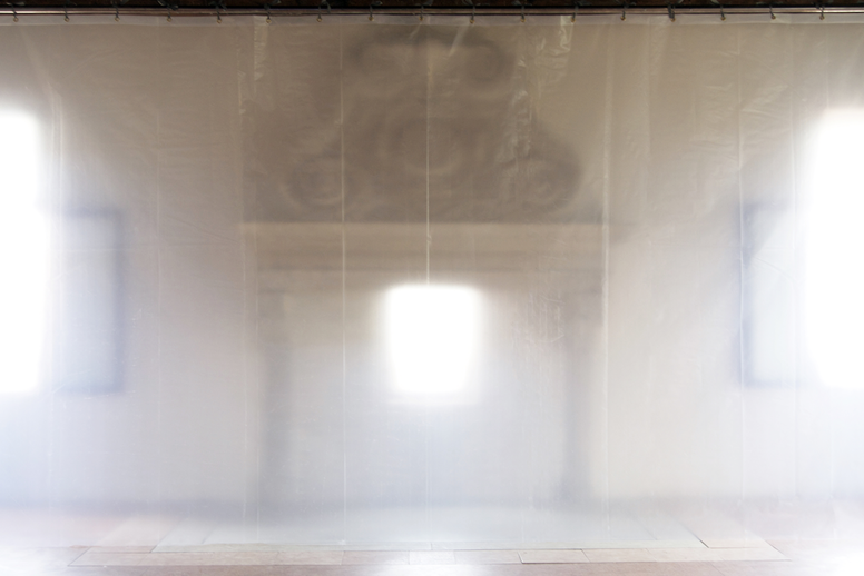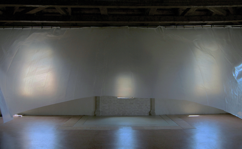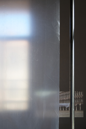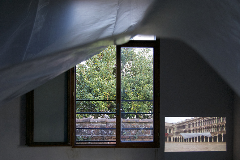 Backdrop (Venice) is an installation and a theatre piece. It is a free reenactment, or partial reconstruction in situ, of Canaletto’s painting La Commedia dell’Arte sulla Piazza San Marco (circa 1720). I temporarily installed the piece in Venice, on the San Marco Square, in May 2017, in the context of the 57th Art Biennale, as part of the group show You Gotta Say Yes to Another Access at the Research Pavilion (II). The device is made up of a large semitransparent polyethylene greenhouse film hung on a removable backstage arch made of steel theatre fly bars. In the reference painting La Commedia dell’Arte sulla Piazza San Marco, Giovanni Antonio Canal, a.k.a. Canaletto (who started to paint by helping his father realize theatre landscape backdrops for Venetian Sant’Angelo and San Cassiano theatres), depicts a stage setting for a theatre performance at sunset on the Piazza San Marco in Venice. As it can be seen in the veduta, monochromatic sheets were traditionally used as stage backdrop in order to frame the performance and focus attention on the proscenium. This separation of the stage from its surrounding environment aimed at enhancing the centripetal intensity of the (human) drama. With the installation Backdrop (Venice), I seek to transpose the Western theatre architecture – based historically on the production of anthropocentric attention – onto an apparatus that expands the (notion of) the stage. Hence, the backdrop here becomes the actor who performs by being “played” by random winds and airflow. With this work I am interested in testing how the scenic logic of segregation between stage and backstage potentially morph into a dynamic of inclusion and codependency, the produced stage emerging as a contingent dispositive of multi-agential assemblage, porosity, and pluritemporality. The backdrop thus does not operate as a functional separation anymore but as an animated passage, suggesting that nothing may exist outside of the stage any longer.