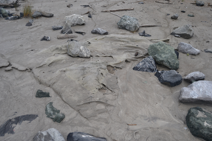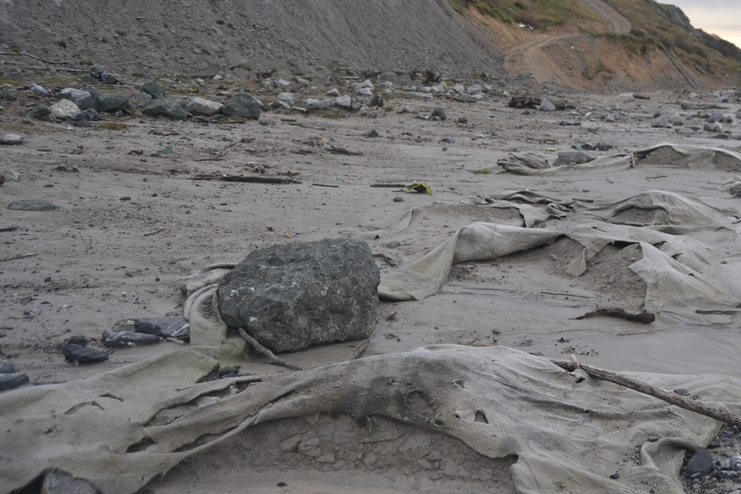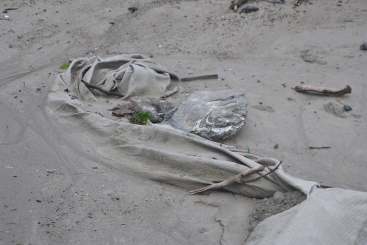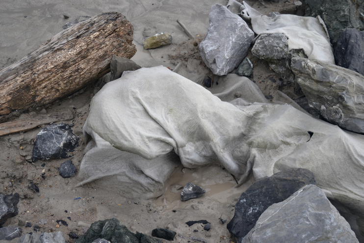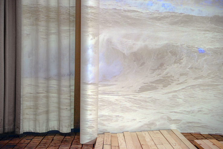 This installation consists of wood beams, paper screen and white molton hanging from a steel structure. The looping video (3') was shot by the Atlantic Ocean, in Biarritz (Basque Country). It is edited with the supplement of a pale, ghostly, glitching blue layer. A series of photographs and a videosimulation of a 3D print of a wrecked ship complement the installation.