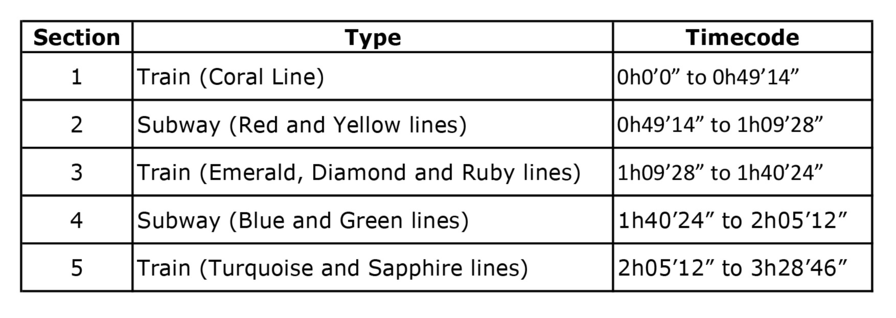From the sound recording, it was possible to analyze the recording according to its sonic qualities related to the type of transport (train or subway) and to the characteristics of the sound recorded during the transportation. For this analysis the final audio was divided into five sections, according to the type of transport (train or subway), as shown in Table 2. The segments on trains are substantially longer than those on the subway: the shortest stretch on a train (31m) is longer than the longest one on the subway (25m). The longest train section lasts 1h23m, reflecting the fact that the railway lines were built to connect different cities while the subway lines were created to connect the neighborhoods of São Paulo.