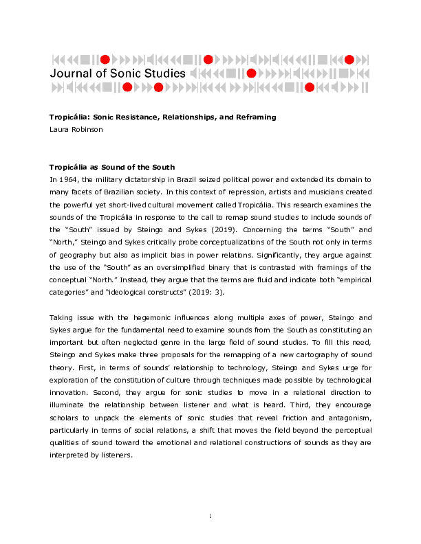 In 1964, the military dictatorship in Brazil seized political power and extended their domain to many facets of Brazilian society. In this context of repression, artists and musicians created the powerful yet short-lived cultural movement called Tropicália. This paper examines the sounds of the Tropicália in response to the call to remap sound studies to include sounds of the “South” issued by Gavin Steingo and Jim Sykes in their edited volume Remapping Sound Studies. Concerning the terms “South” and “North,” they critically probe conceptualizations of the South not only in terms of geography but also as implicit bias in power relations. Significantly, they argue against the use of the “South” as an oversimplified binary that is contrasted with framings of the conceptual “North.” Instead, they argue that the terms are fluid and indicate both “empirical categories” and “ideological constructs” (Steingo and Sykes 2019: 3). Taking issue with the hegemonic influences along multiple axes of power, Steingo and Sykes argue for the fundamental need to examine sounds from the South as constituting an important but often neglected genre in the large field of sound studies. To fill this need, they make three proposals for the remapping of a new cartography of sound theory. First, in terms of sounds’ relationship to technology, Steingo and Sykes urge for exploration of the constitution of culture through techniques made possible by technological innovation. Second, they argue for sonic studies to move in a relational direction to illuminate the relationship between listener and what is heard. Third, they encourage scholars to unpack the elements of sonic studies that reveal friction and antagonism, particularly in terms of social relations, a shift that moves the field beyond the perceptual qualities of sound toward the emotional and relational constructions of sounds as they are interpreted by listeners.