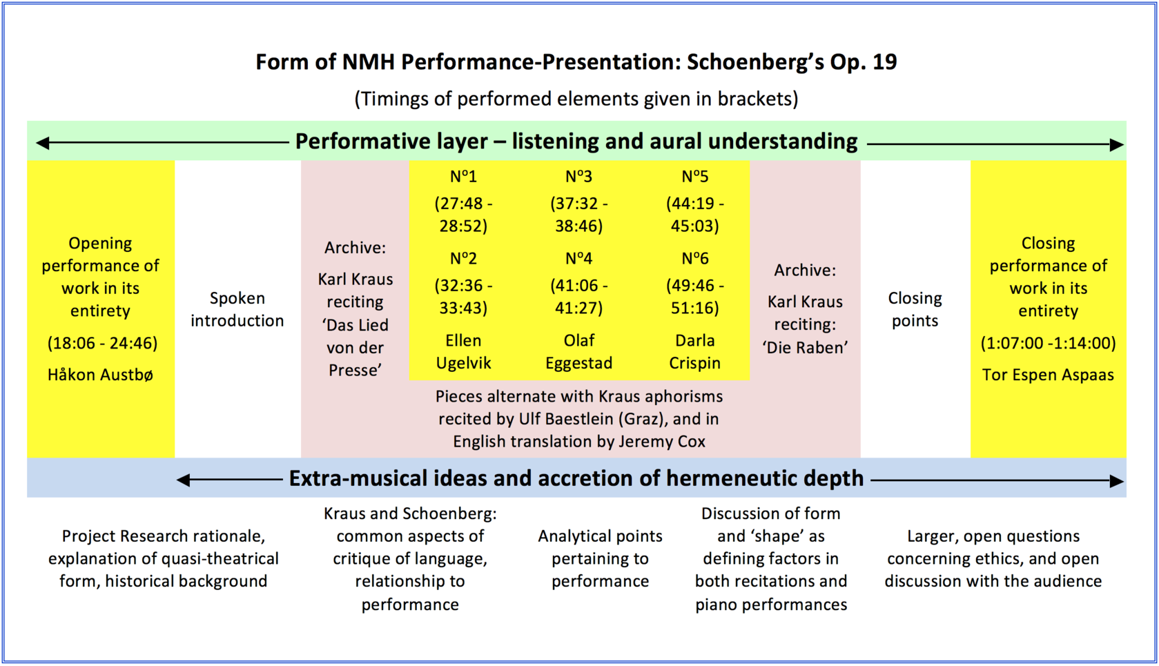 The performance, whose structure is indicated diagrammatically as part of this exposition, including timings of performances in the accompanying video, emphasised that it is within the character of Kraus - his manner of recitation, his process of structuring utterances both through the practice of writing and that of performance - that Schoenberg detected a sonorous language critique that echoed his own in the musical/non-verbal sphere.