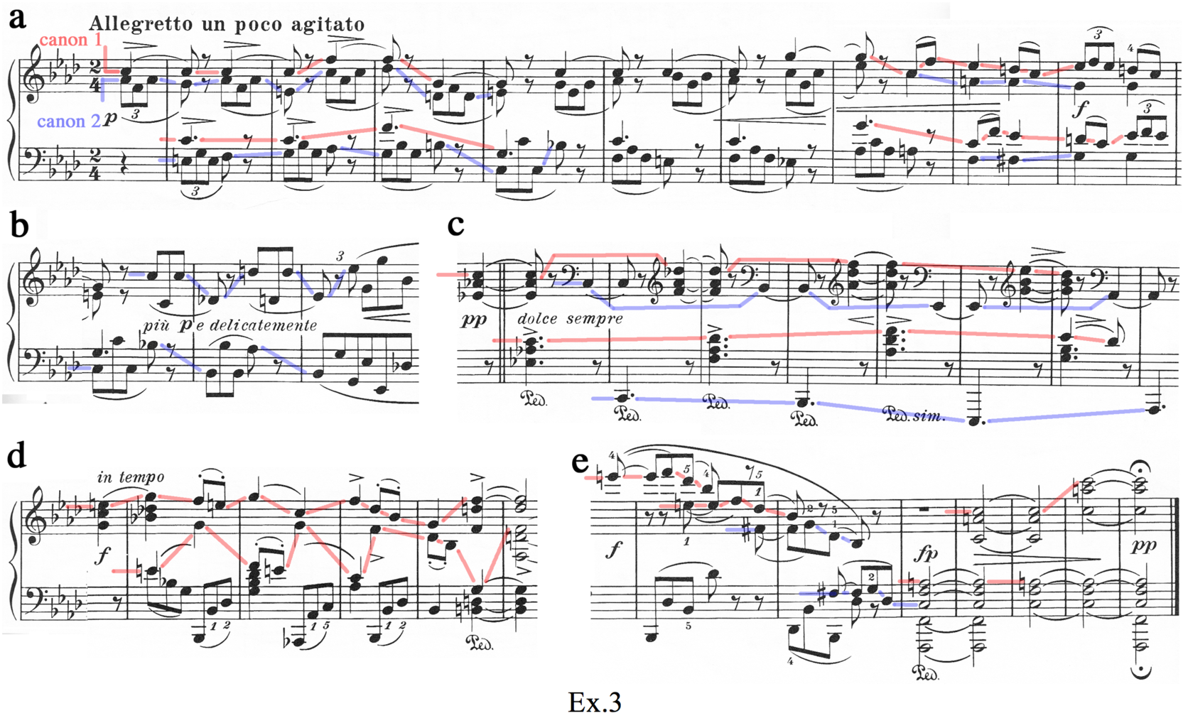 At bar 91 (d) one is brutally awakened from this unsettling dream by a dramatic outburst that reintroduces the motif a2 in the rhythm of no. 2, still in canon, before the recapitulation of the first canon, now in forte, più agitato. The canon maintains its grip on the texture until the very end (e) but slows down in the last 5 bars by stretching the distance between entries from half a bar to a whole bar.