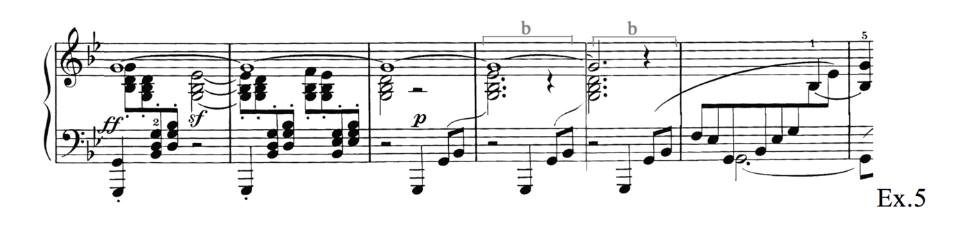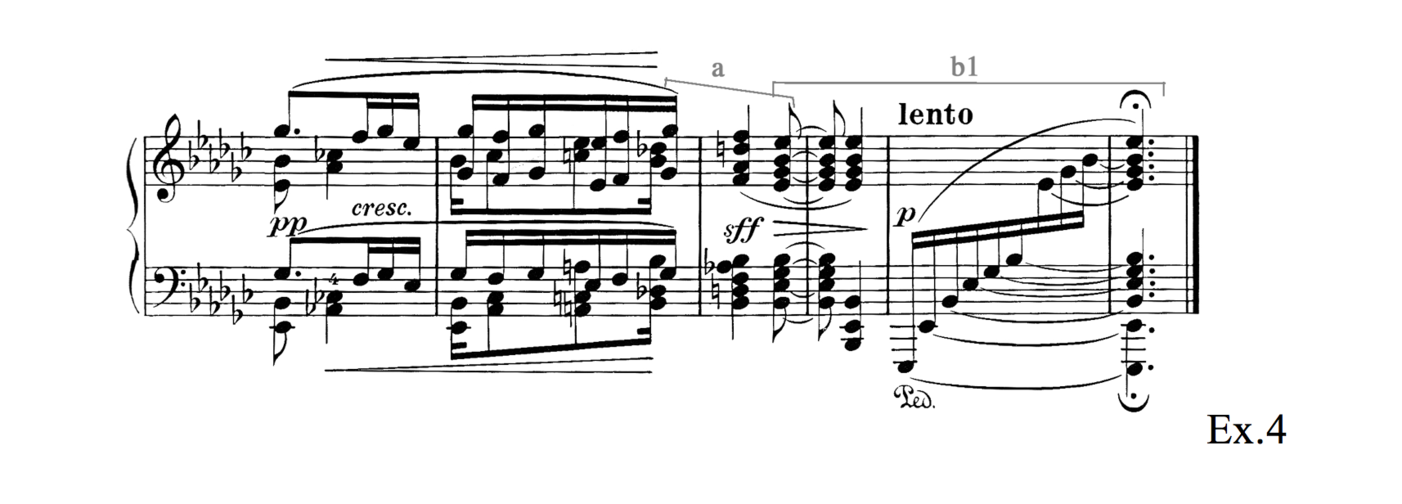 Along the same line of thought, the Romanze in F Major (no. 5) should then be the recapitulation. In fact, the themes from no. 1 and no. 2 are both restated simultaneously here. The upper voice takes on a similar rhythm as in no. 1 (see ex. 2), albeit that it starts on the first beat. The lower voice starts with a rising sixth in upbeat, then follow three statements of motif a2, in inversion here but still evoking the theme of no. 2, also including the theme of the dramatic outburst in no. 4 mentioned above (d of ex. 3). Follows a bar based on the motif c: the rising fourth followed by a descent.