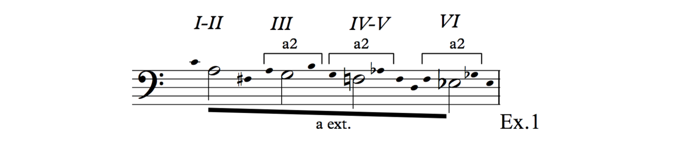 Not only does the descent of tonality reflect the main motif that is heard at the beginning of the cycle - the descending three notes a, extended to four - but together with the secondary tonalities a pattern emerges that contains the main melodic motif, a2, which is a permutation of the same three notes and generates the theme of no. 2. [2]