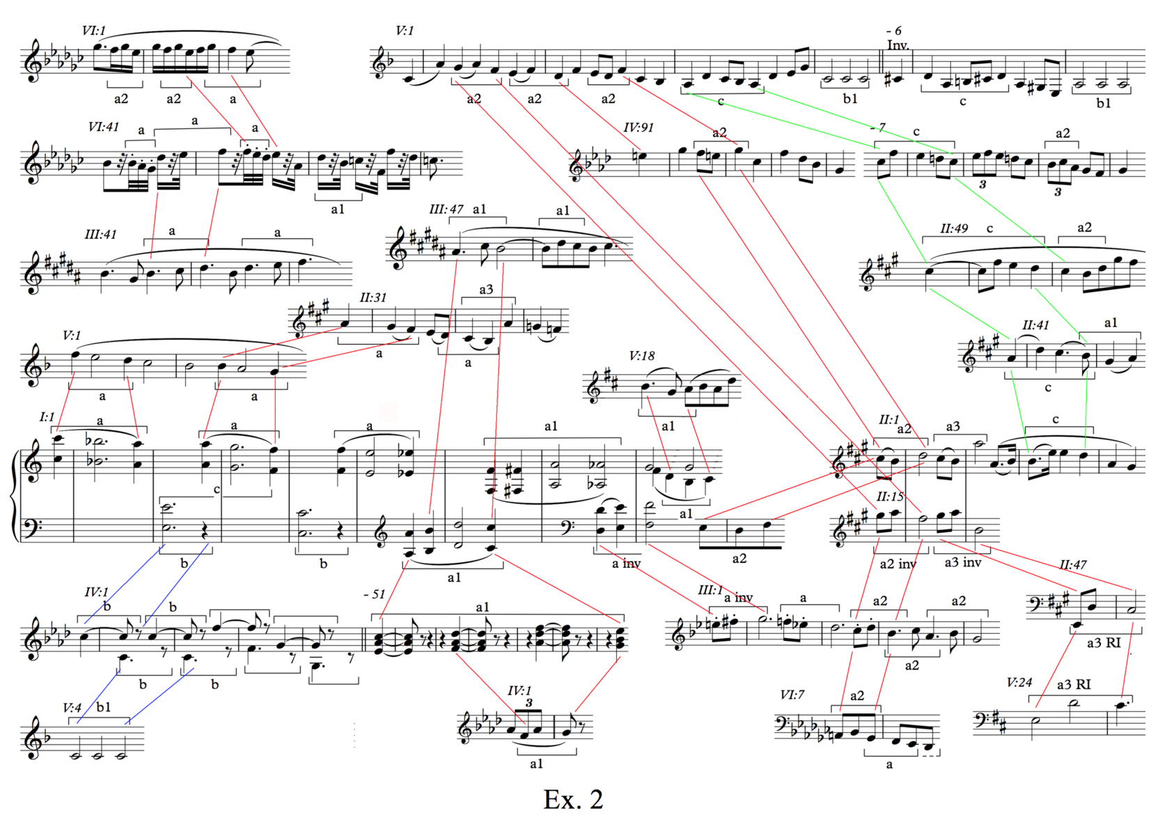 In this diagram, one can see that the two root motives, a and b, together form the intervals of a third motif c. a1 and a2 are permutations of a. a2 is the base of the second piece, here followed by a3, a stretched-out version of a2, where the ascending third has become a seventh. However, if read within the same octave, one finds back the three consecutive pitches of the original motif a. The principal connections of these motives across the pieces are shown with lines of different colours.