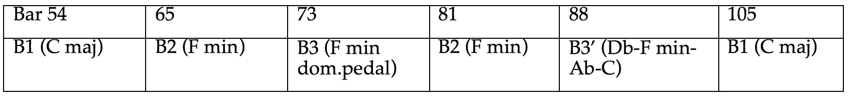 The last part of theme B will be a repetition of the first stanza emerging from the C major that is reached in bar 103. It stays, unresolved, on the C major. To summarise, we get the following scheme for theme B: