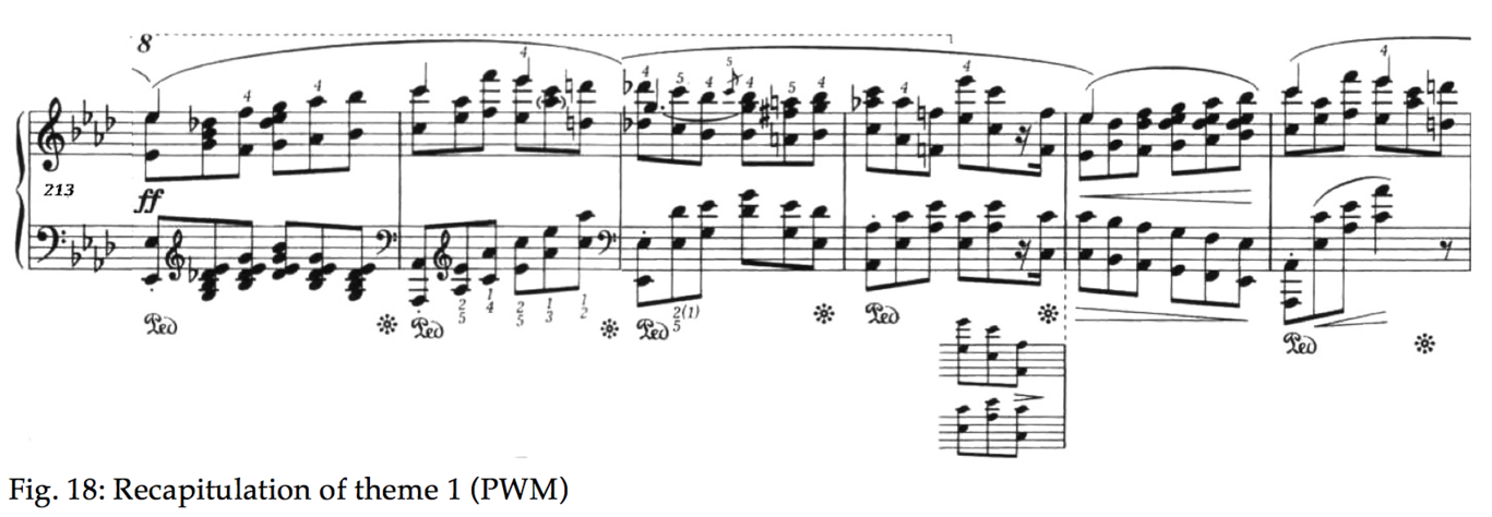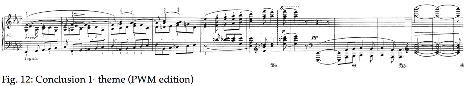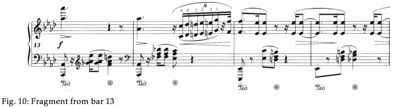 The concluding treble chord on top of the deep octave, characterised by Cortot ‘as a moonray on an idyll’ [21] gives a strong feeling of closure to the whole section of theme A, which, after an excursion to C major, calmly returns to Ab via the dominant. The bars of development shown in Fig. 12 are necessary to balance out the tension and to restore the calm in a masterly disposition of registers.