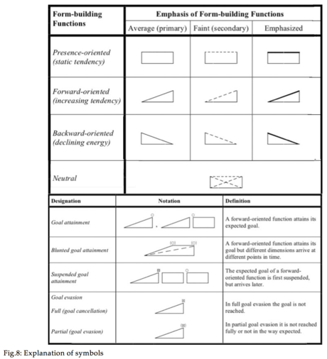 Through surveying the analysis of dynamic forms, the reader will be able to easily observe the form-building contrasts between stable time segments (squares) and unstable passages (triangles). The bold lines added indicate that one of these functions is emphasized.