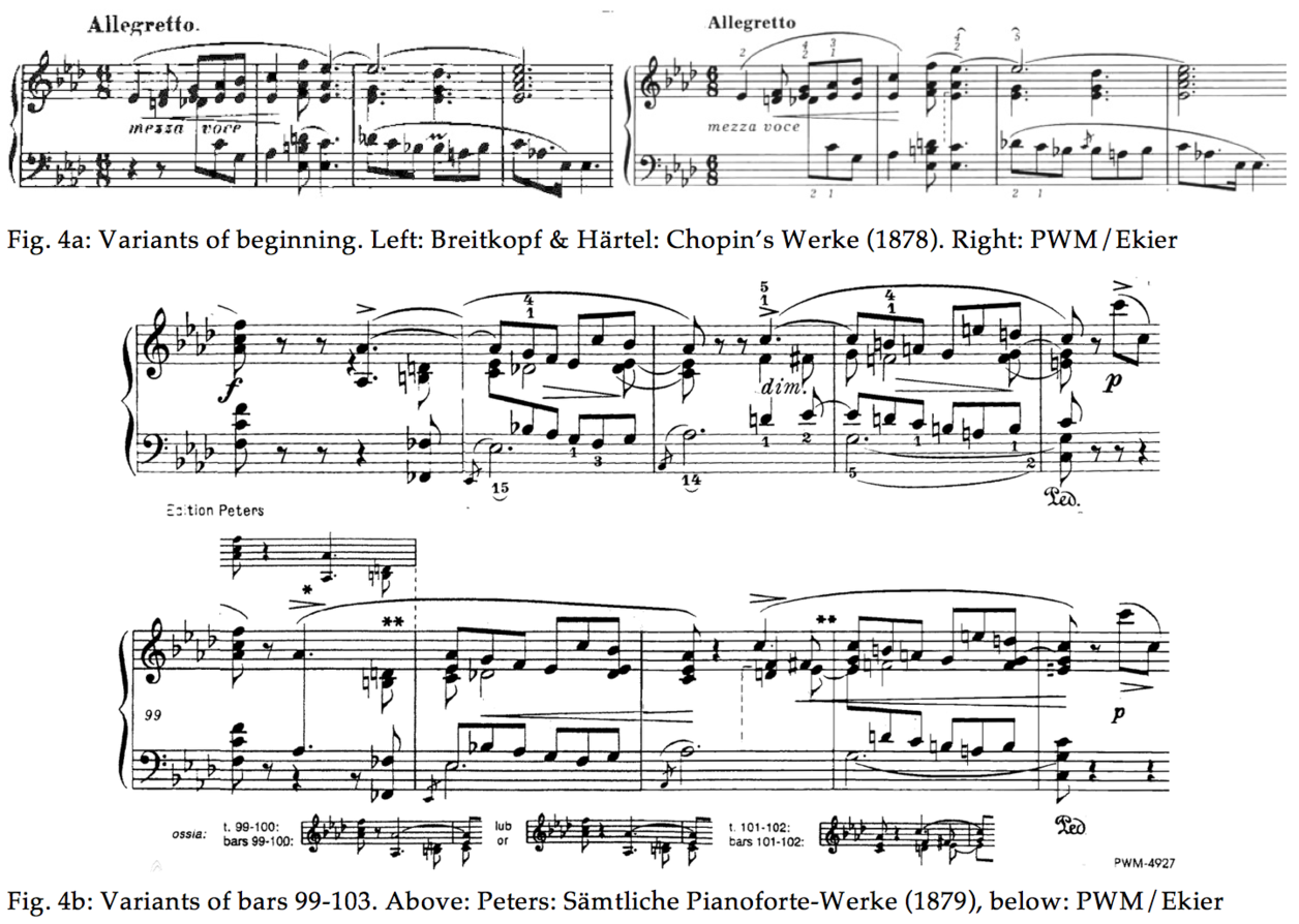 For the Third Ballade, the variants don’t present dramatic differences. But earlier editions do. The phrasing of the first theme is one example, and another passage, starting at bar 99, is particularly interesting. Fig. 4 shows both passages in two different editions.
