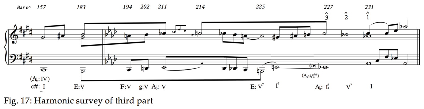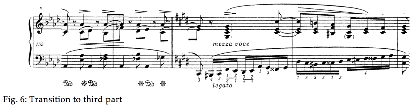 There are other ways to describe the form of the piece. We can look at it as a lied form with the central episode as a contrasting section, followed by a mirrored recapitulation of both themes of the main section [16]. However, such a disposition wouldn’t account for the dramatic change of character with the turn to C# minor, which clearly announces a new section in the piece. This is precisely what makes the form so ambiguous and therefore so interesting in comparison with a prototypical sonata form. The fact that the middle part (at bar 116) has a tonal stability on the tonic that it shares with the beginning and end sections makes it neither the contrasting part of a lied form nor the development section of a sonata form. What function does it have, then? It introduces a pianistically brilliant character and joyful excitement through the use of semiquavers, after the longing, swaying rhythm of theme B. Tonally, it provides stability after this unstable theme that vacillates between C and F. It also prepares for the reintroduction of the same theme B departing from Ab major which in its turn becomes unstable and moves on to D flat, enharmonically C sharp, reflecting the movement from C to F before.